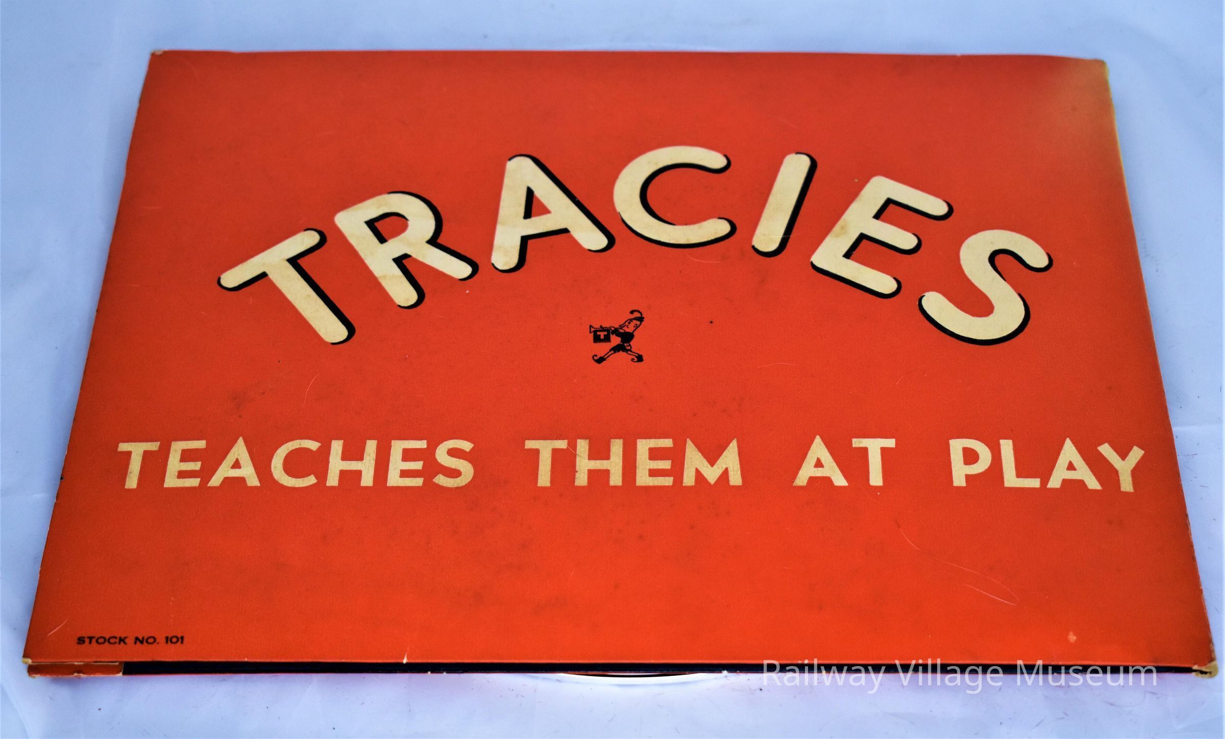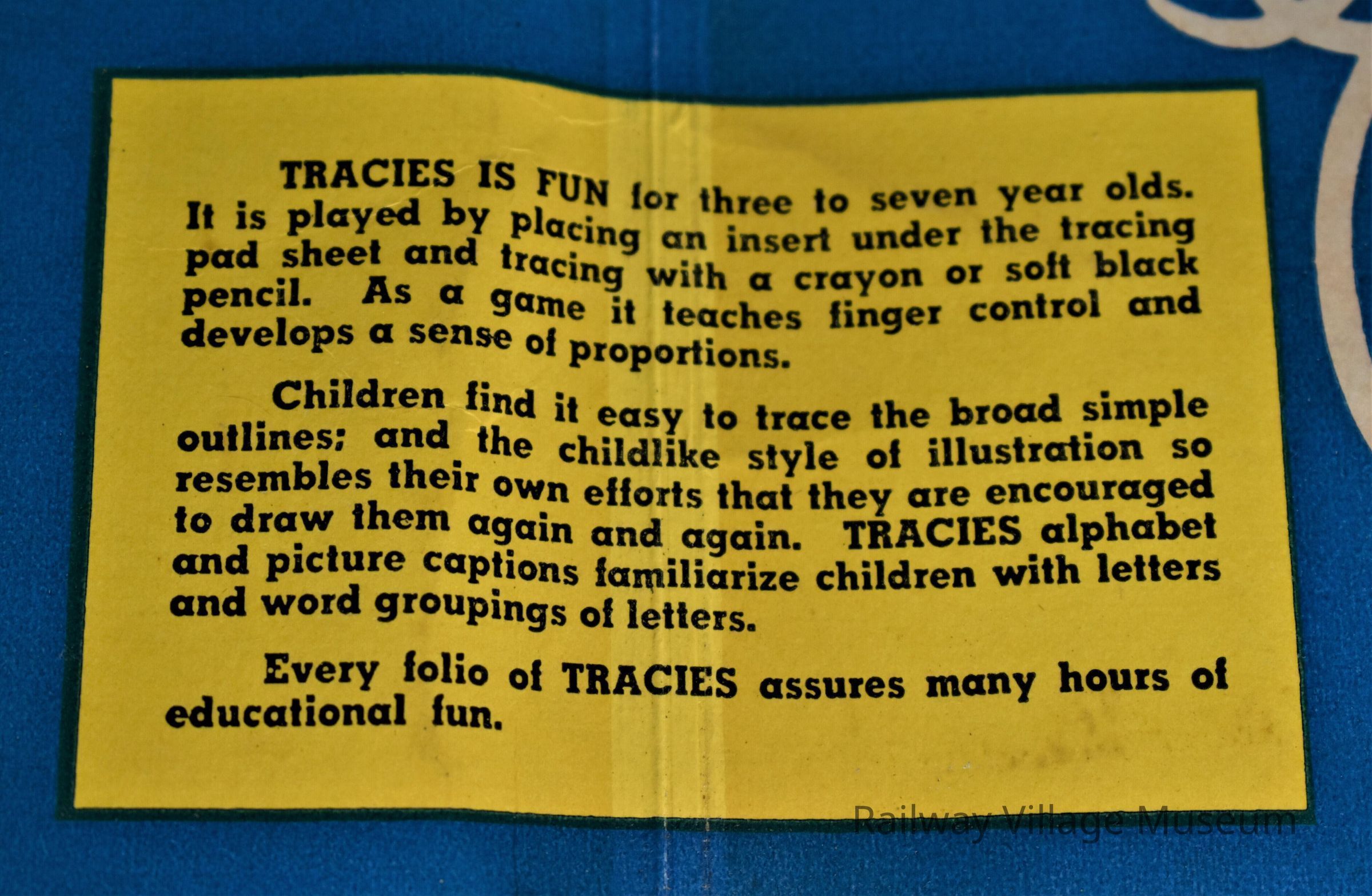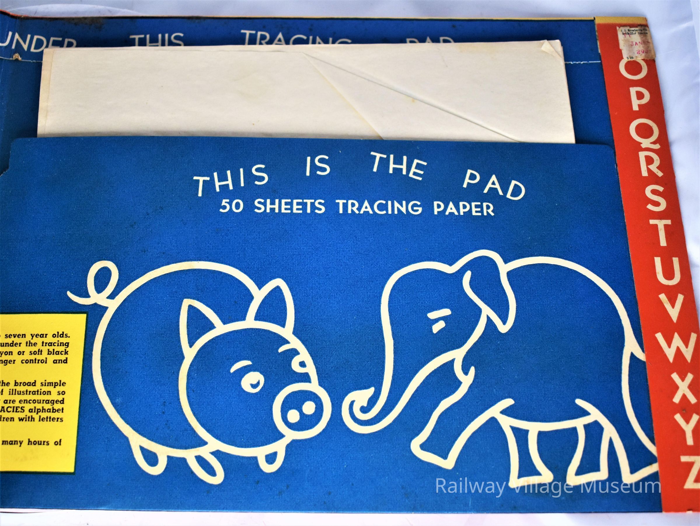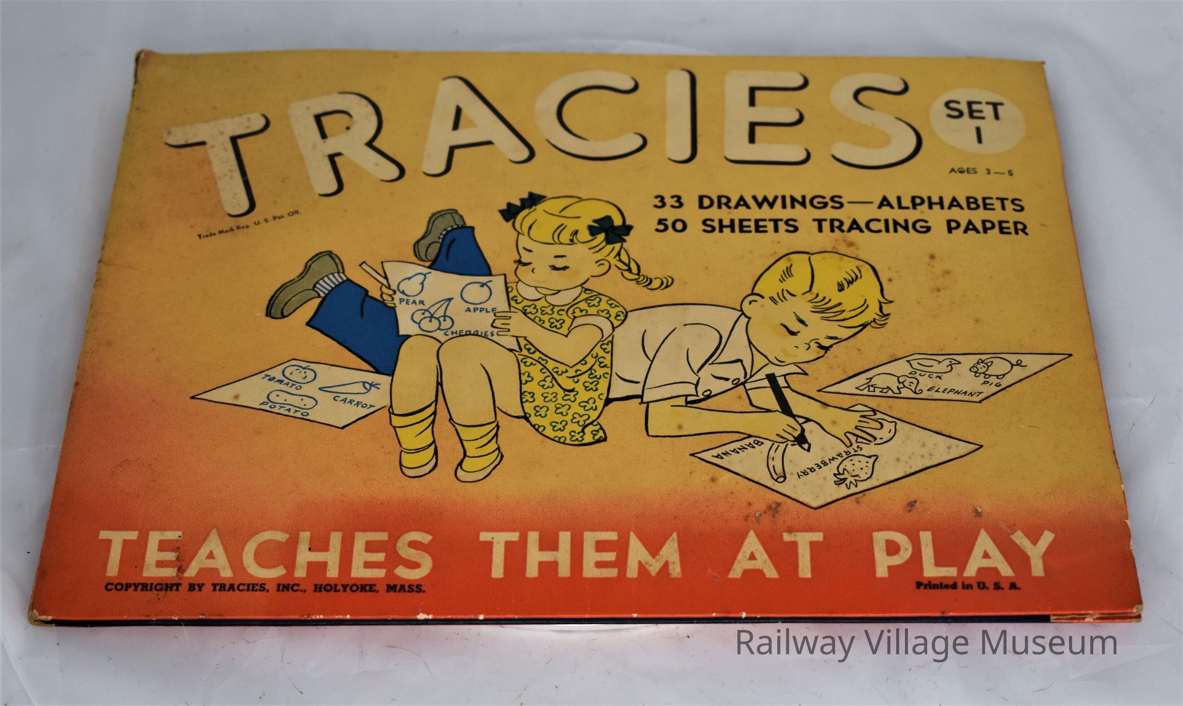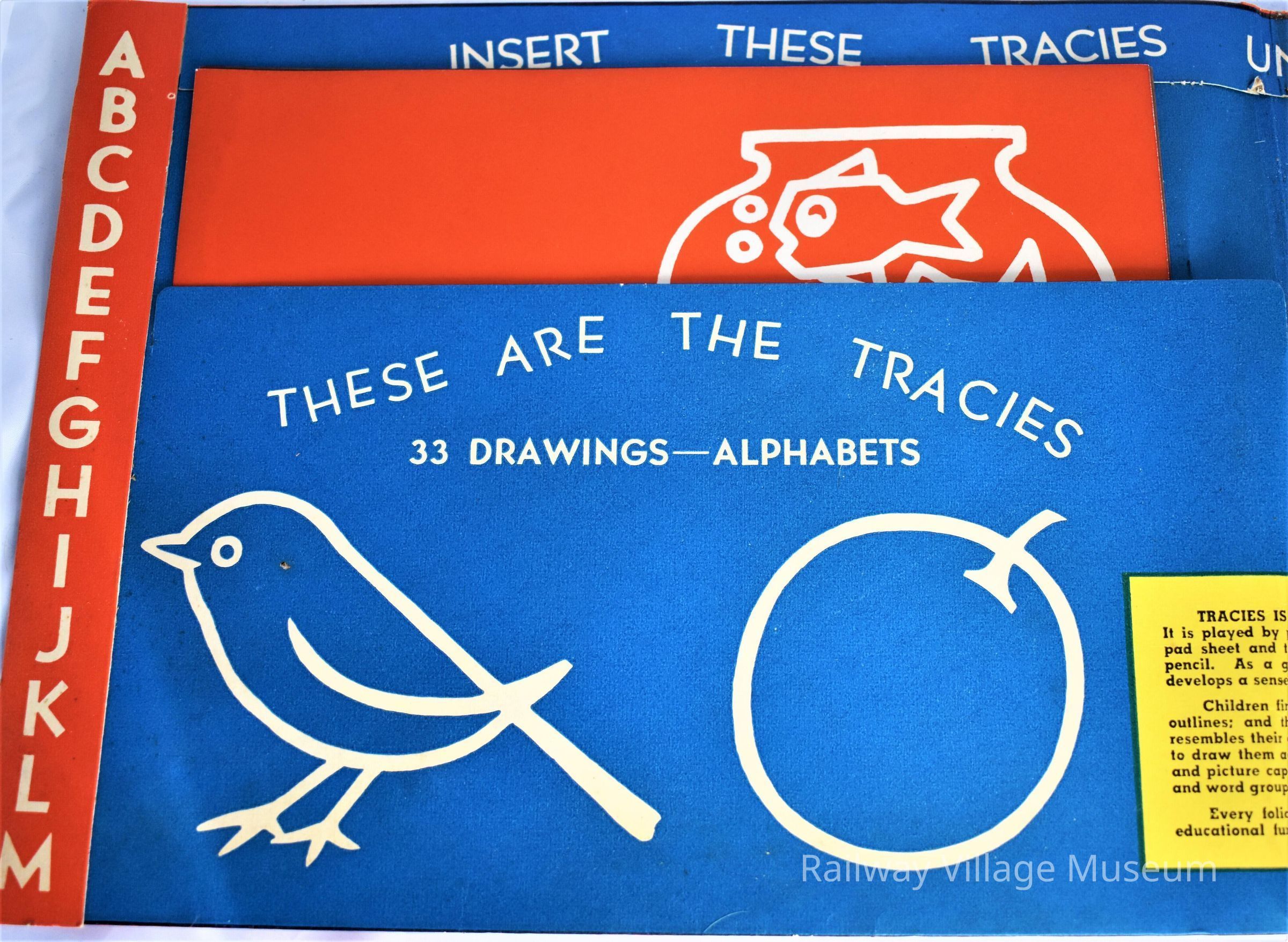 Tracies was a fun, learning craft, that taught children the alphabet through tracing pictures. On the left side, this Tracies has five sheets of drawings, double-sided, and with two pictures per side. It also has one sheet with the alphabet itself, also double-sided. On the right side, this Tracies has a stack of tracing paper.Made/Created