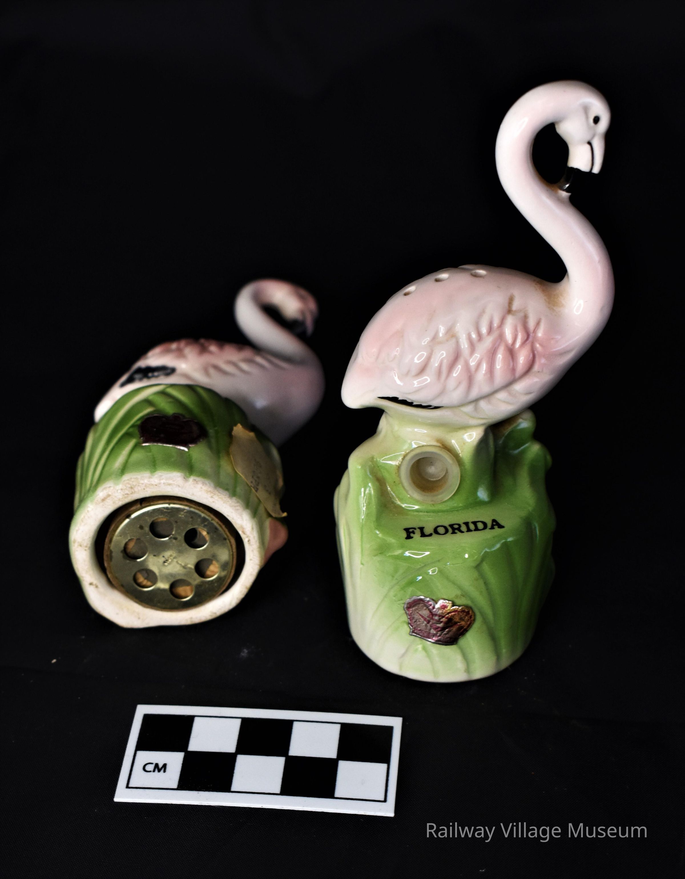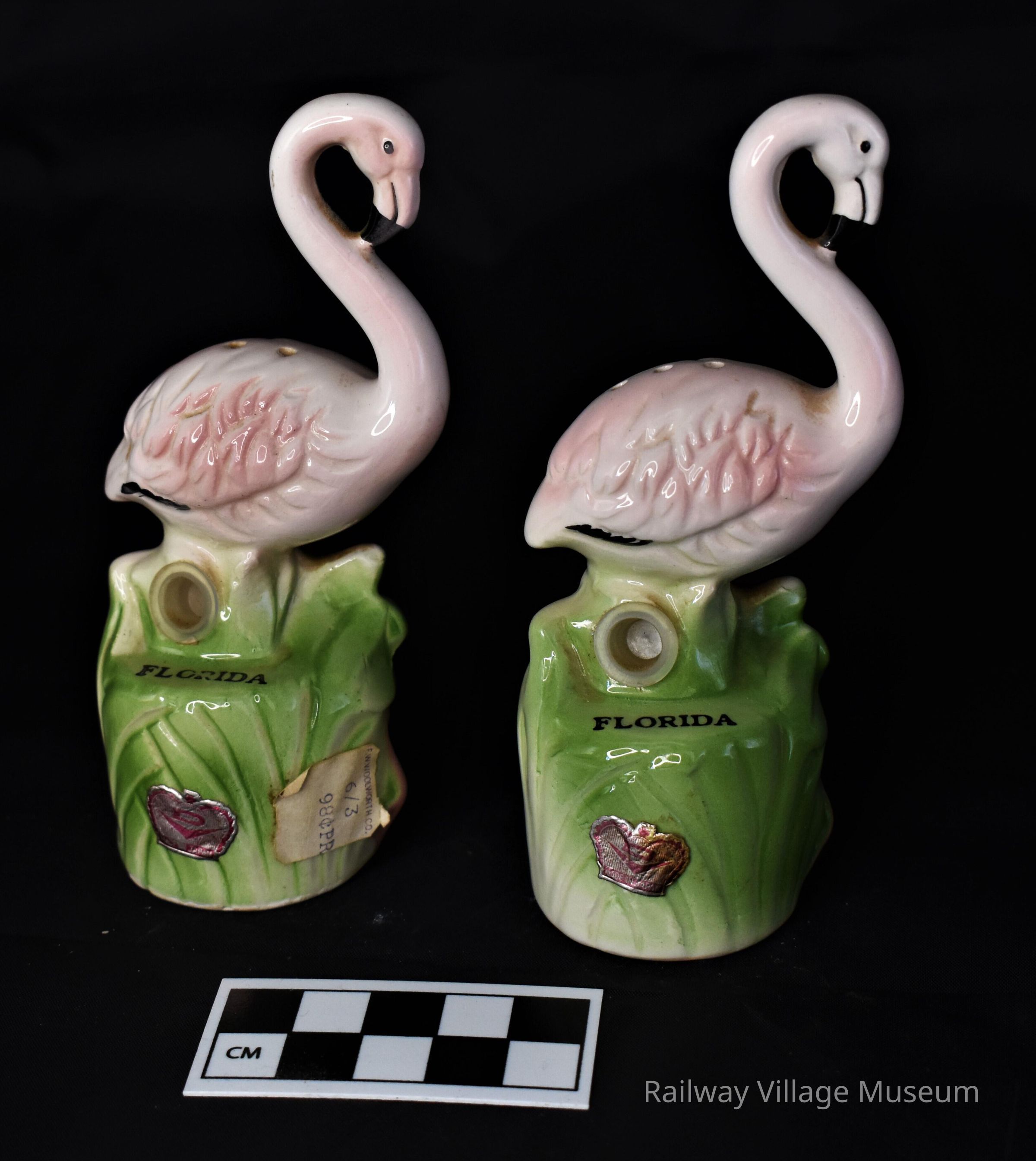 Matching flamingo ceramic shakers. Souvenirs of Florida. Both have a crown shaped foil sticker that says, "Made in Japan" and the letter "D". Manufacturer is unknown. One has a wood and metal base and a seller's sticker from F.W. Woolworth Co. 6/3 and that they cost $ .98.