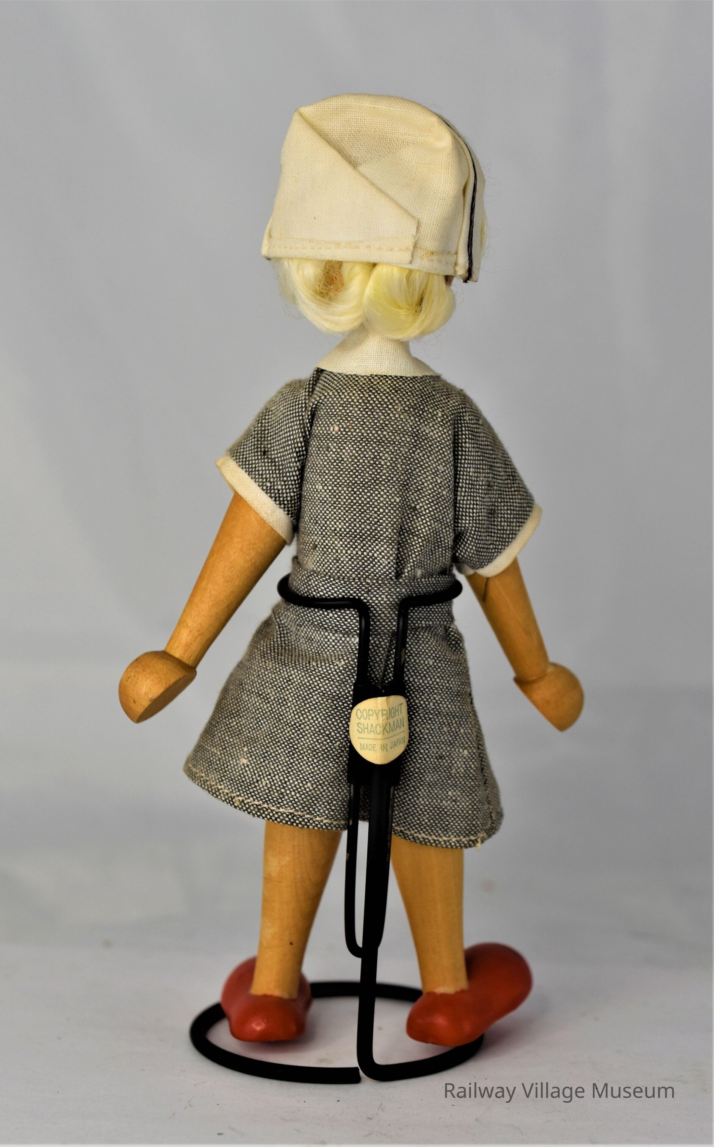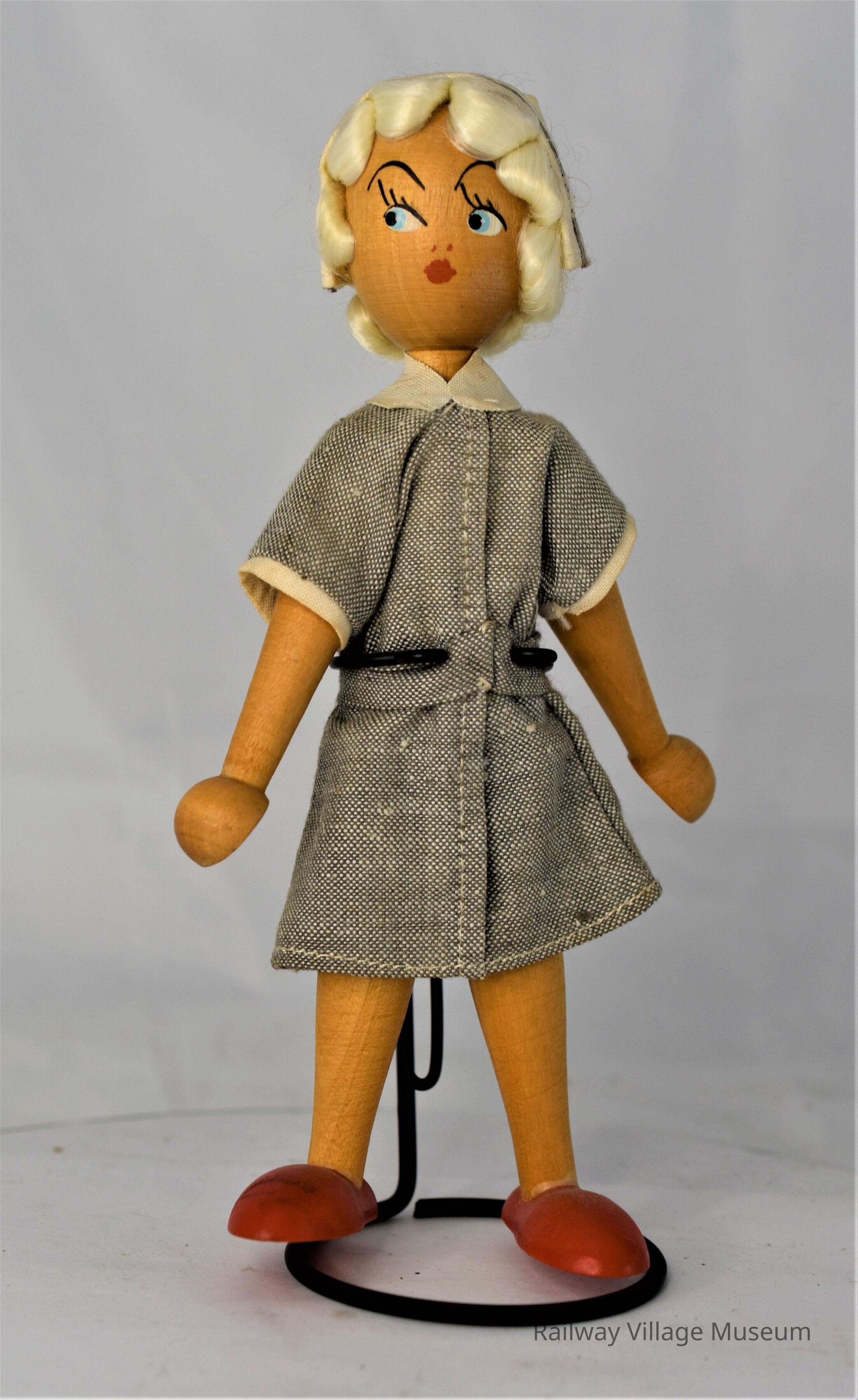 A wooden doll, like the other but missing the "Made in Poland" sticker. It's wearing a grey dress with a white cap.Lexicon