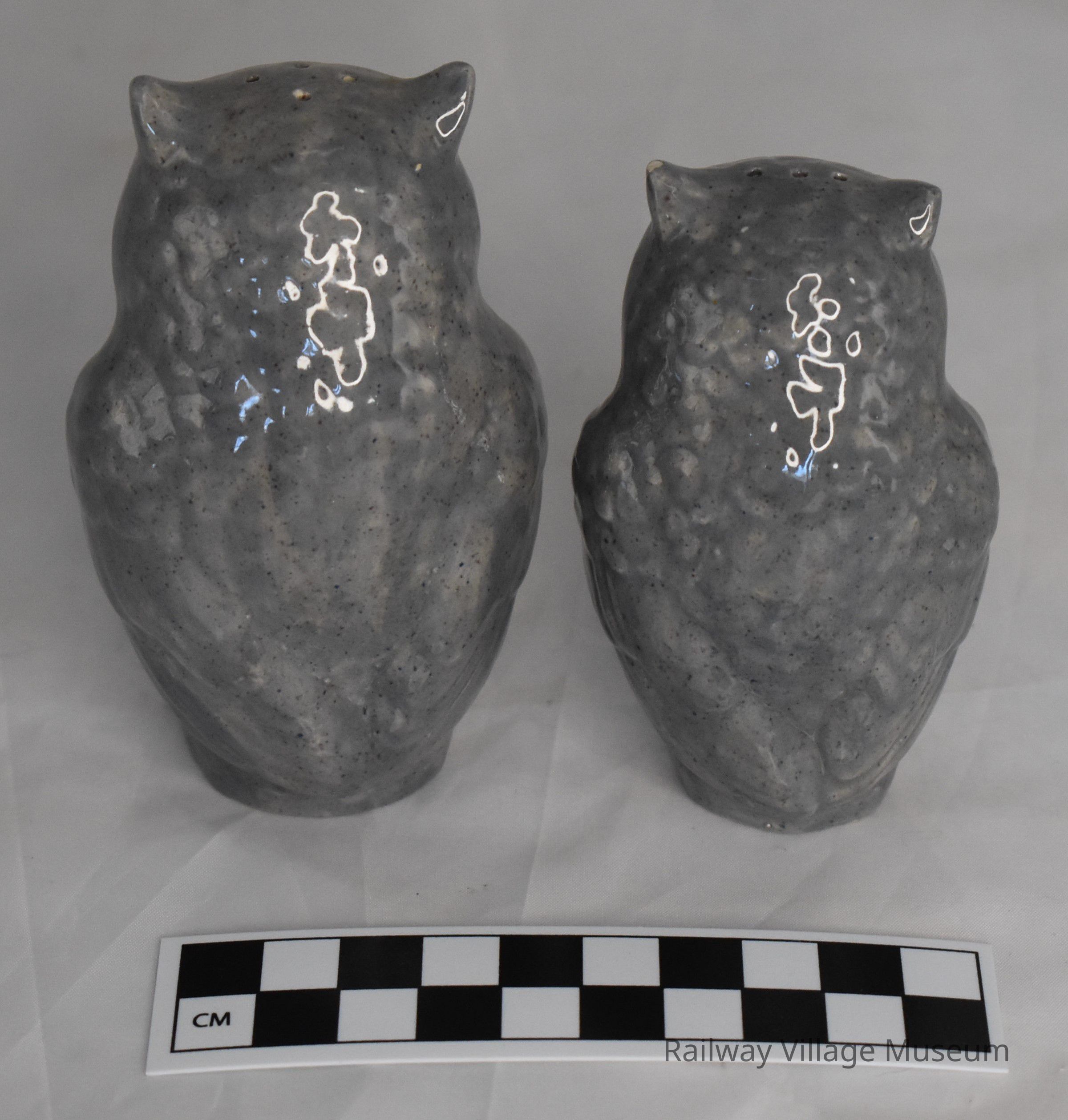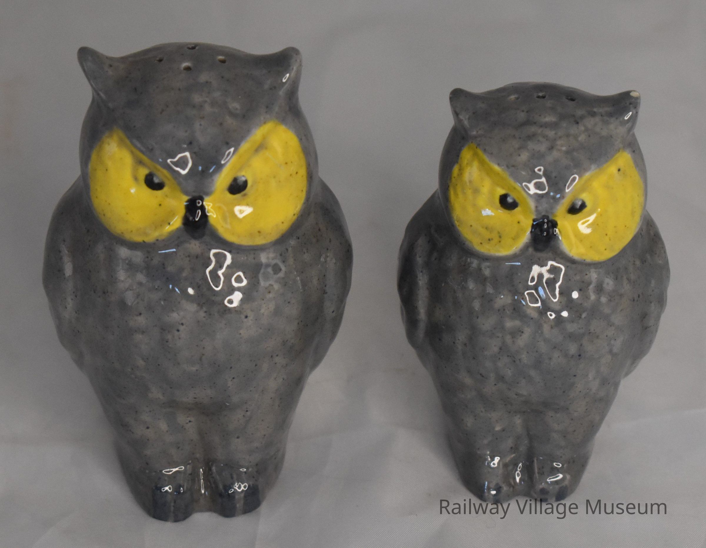 Large and small vintage ceramic yellow and gray figural owl salt and pepper shakers.