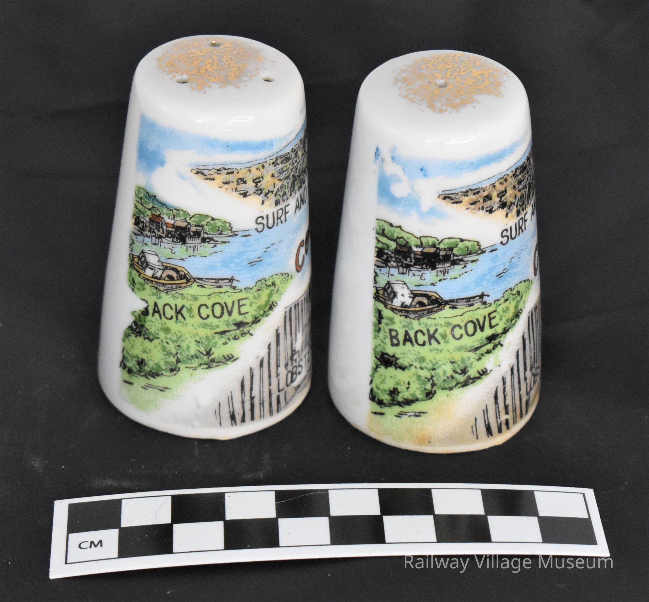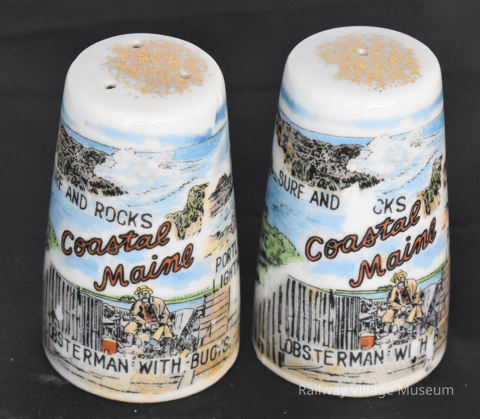 Vintage ceramic souvenir for Coastal Maine salt and pepper shakers. Scenes of Surf and Rocks, Lobsterman with Buoys, the Portland Lighthouse, and Back Cove. Made in Japan.Made/Created