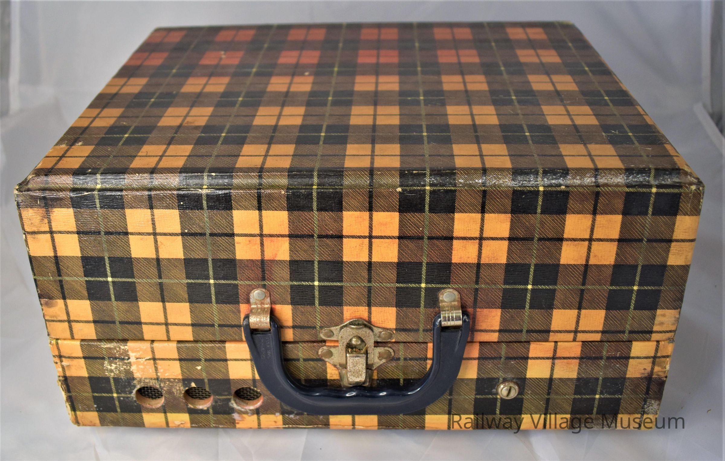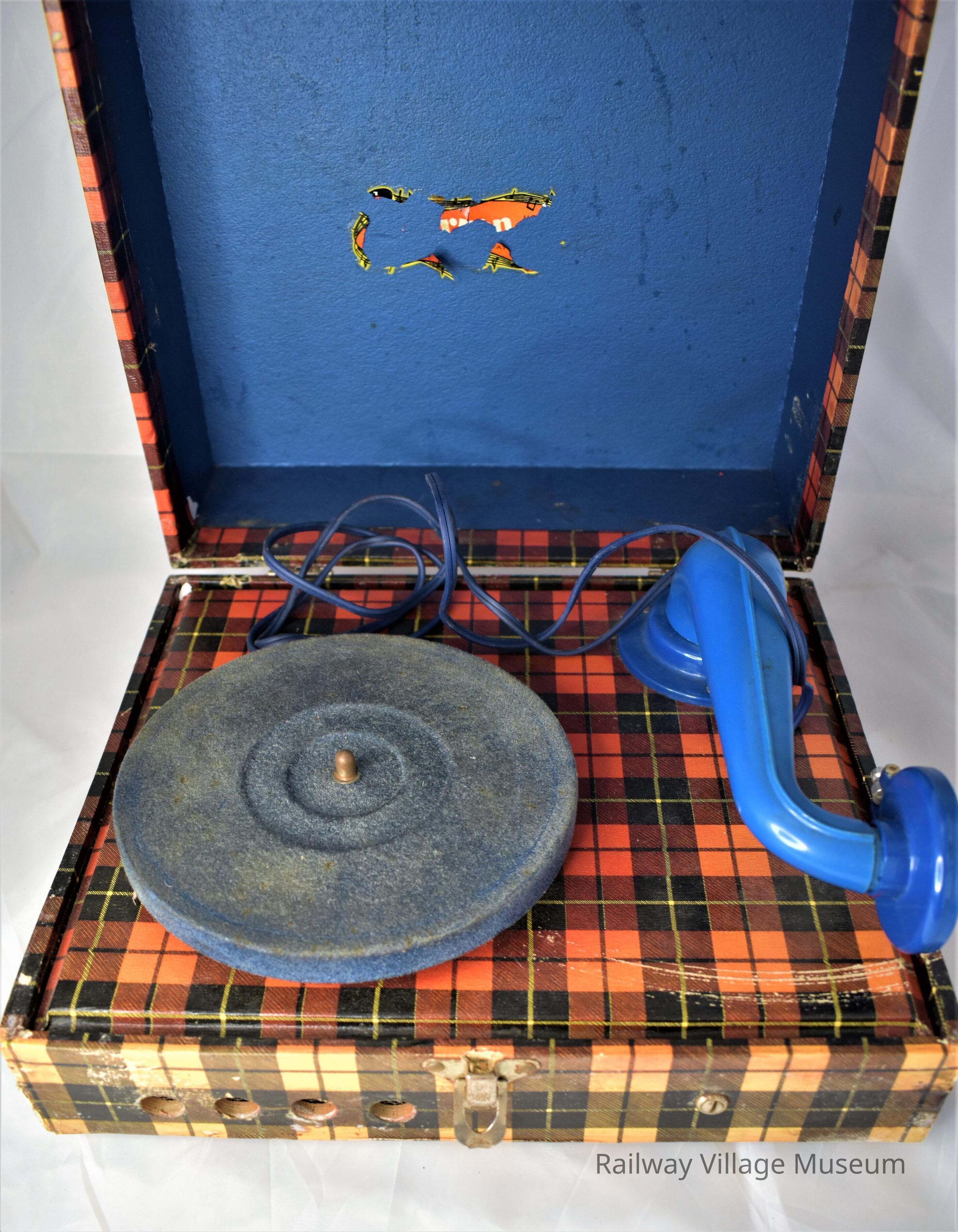 This toy record player was manufactured by Carron, and still works! Once it's plugged in, you put the toy needle on the record and flipped the switch. On the lid, there are the remains of Carron's sticker.Made/Created