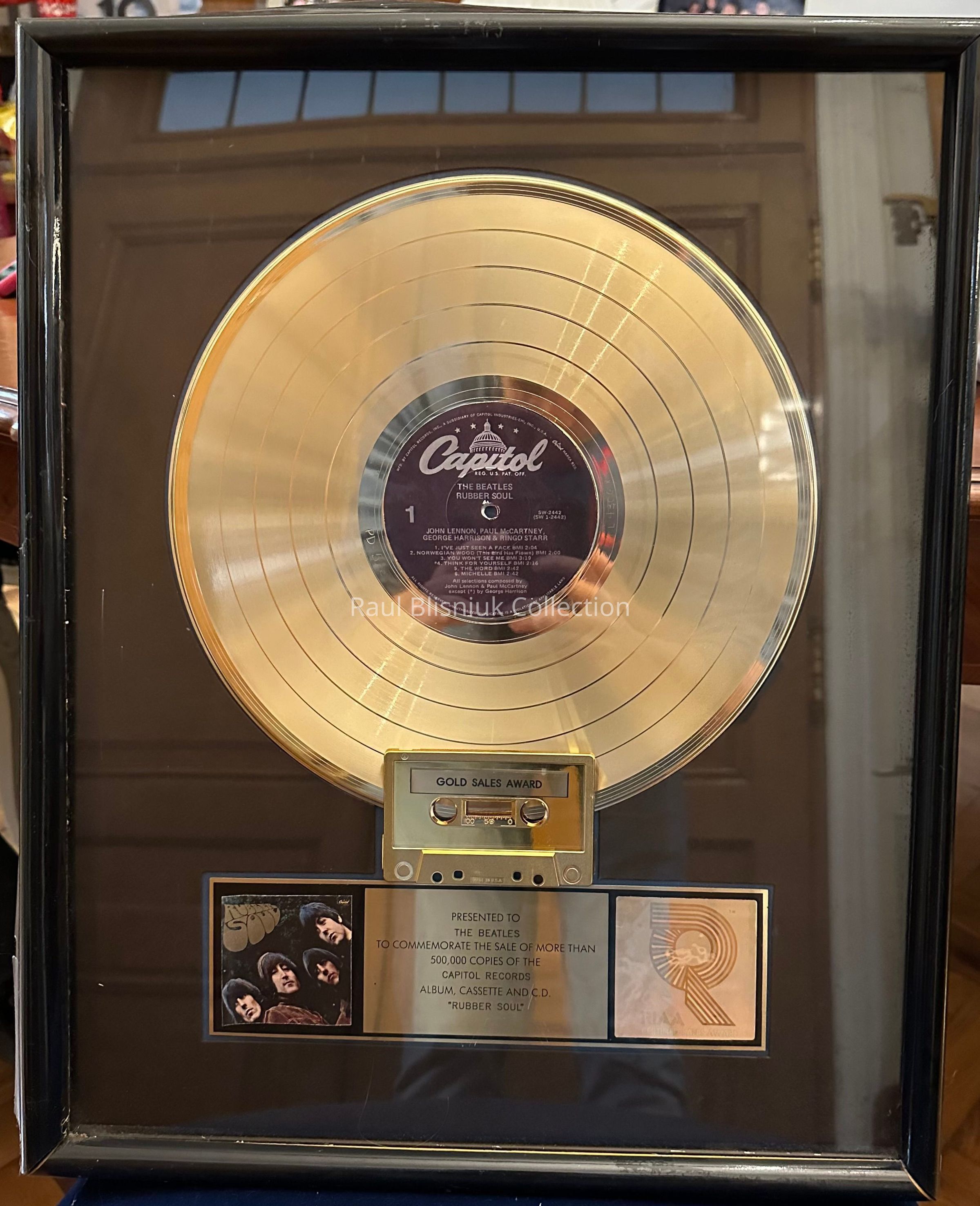 A RIAA "gold" record award presented to The Beatles to commemorate the sale of more than 500,000 copies of the Capitol Records album, cassette and C.D. "Rubber Soul".