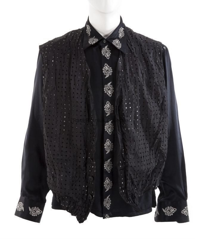 A long sleeve black silk shirt with silver embroidered paisley florettes. Together with an intentionally wrinkled black vest with punched holes revealing silver lining by Issey Miyake. Starr was photographed wearing the ensemble while performing with his "All Starr" Band in May of 2000.
