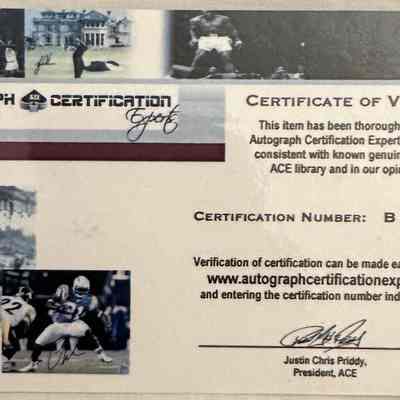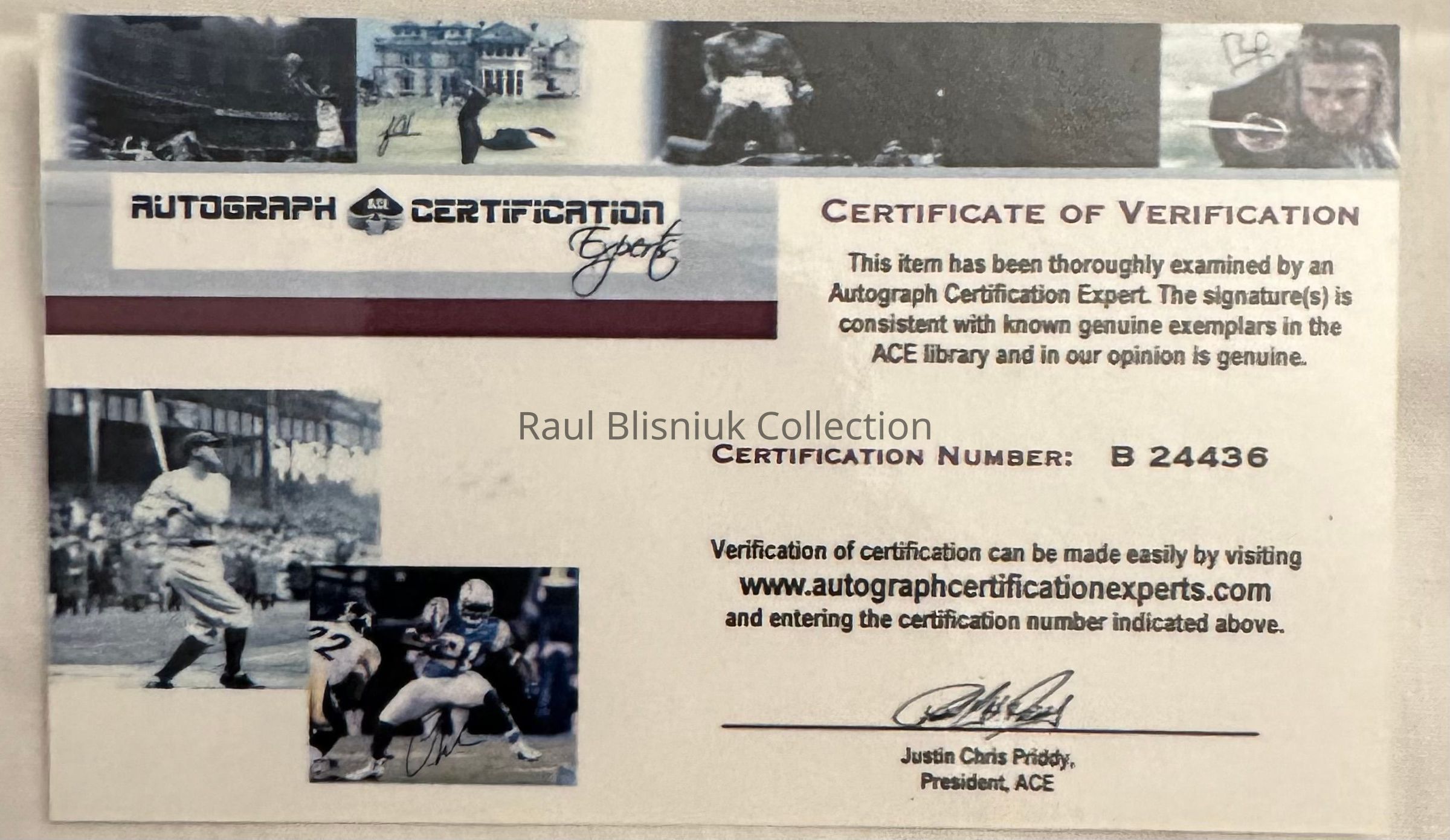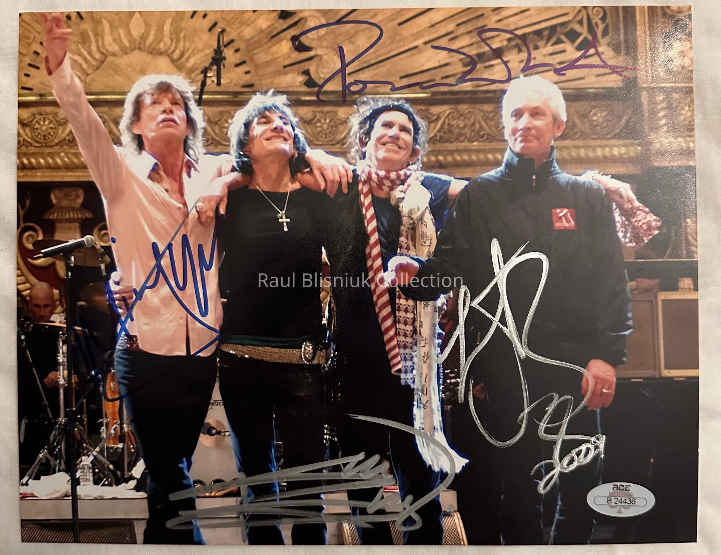 Hand-signed by all 4 band members in blue/silver felt tip pen. Authenticated by Autograph Certification Experts (ACE) and includes their official serially numbered hologram and matching COA. Dated 2009 by Charlie Watts.
