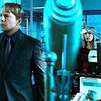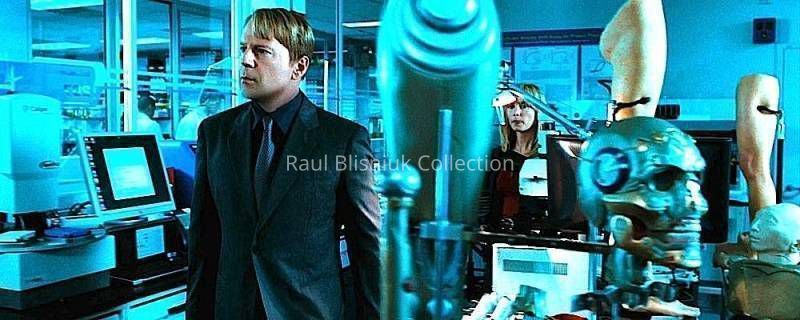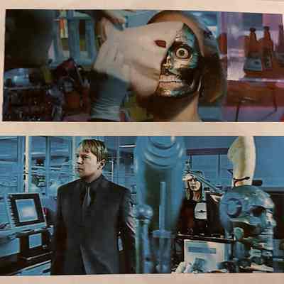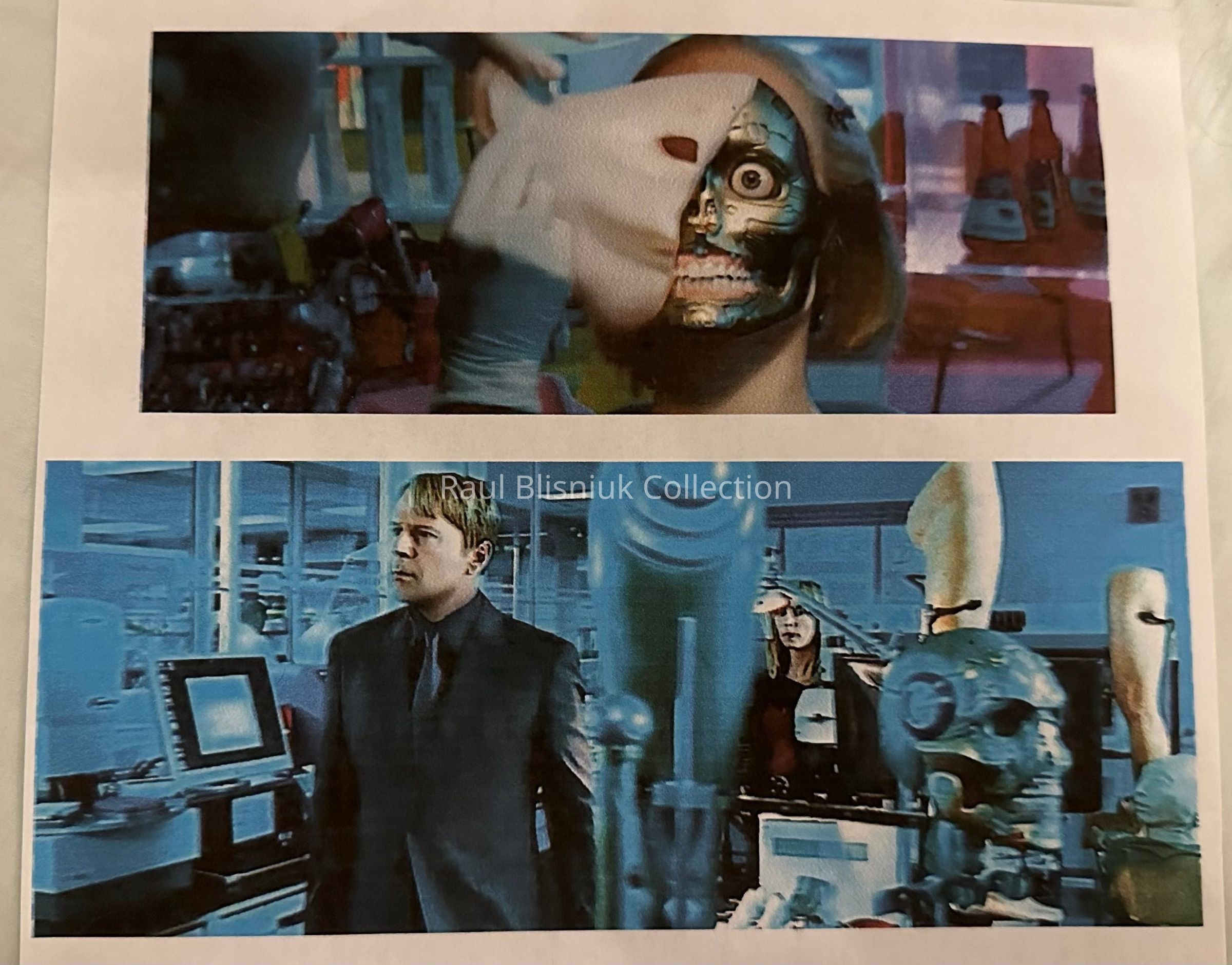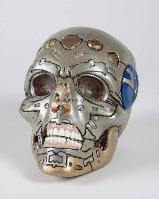 A robotic Surrogate head used in the futuristic thriller Surrogates (Touchstone Pictures, 2009). This fiberglass skull is hollow and handpainted. It can be seen as FBI agent Tom Greer, played by Bruce Willis, investigates the lab. Accompanied by a copy of the film. Approximately 8 by 6 inches