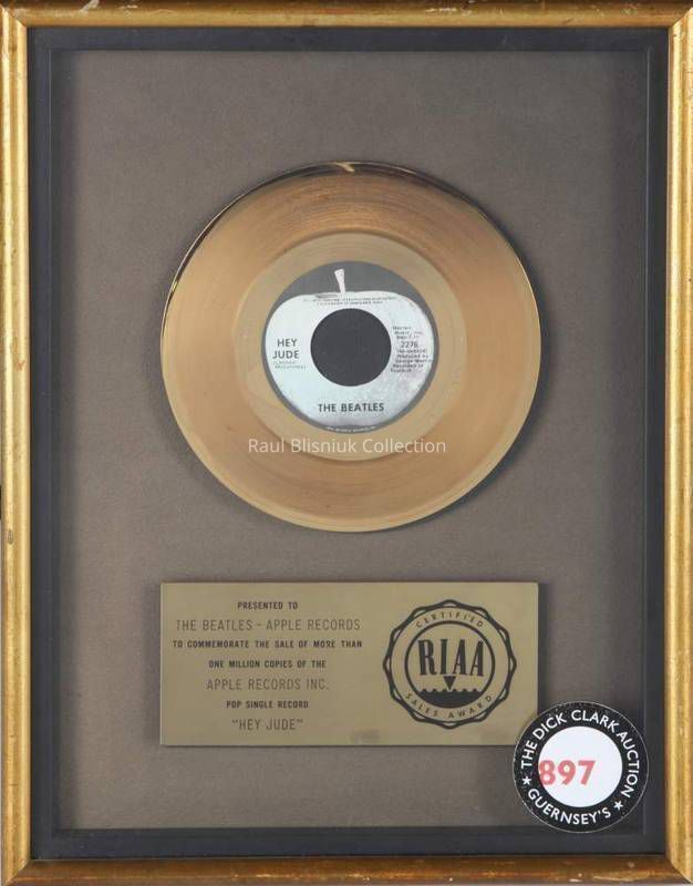 An RIAA "gold" record award presented to The Beatles-Apple Records to commemorate the sale of more than one million copies of the pop single record "Hey Jude."