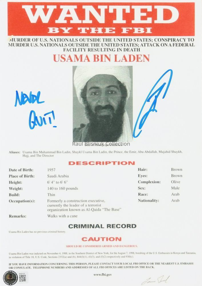Robert O’Neill Signed Usama Bin Laden Wanted Poster 11x14 Photo Inscribed “Never Quit!” (Beckett)Entry/Object ID