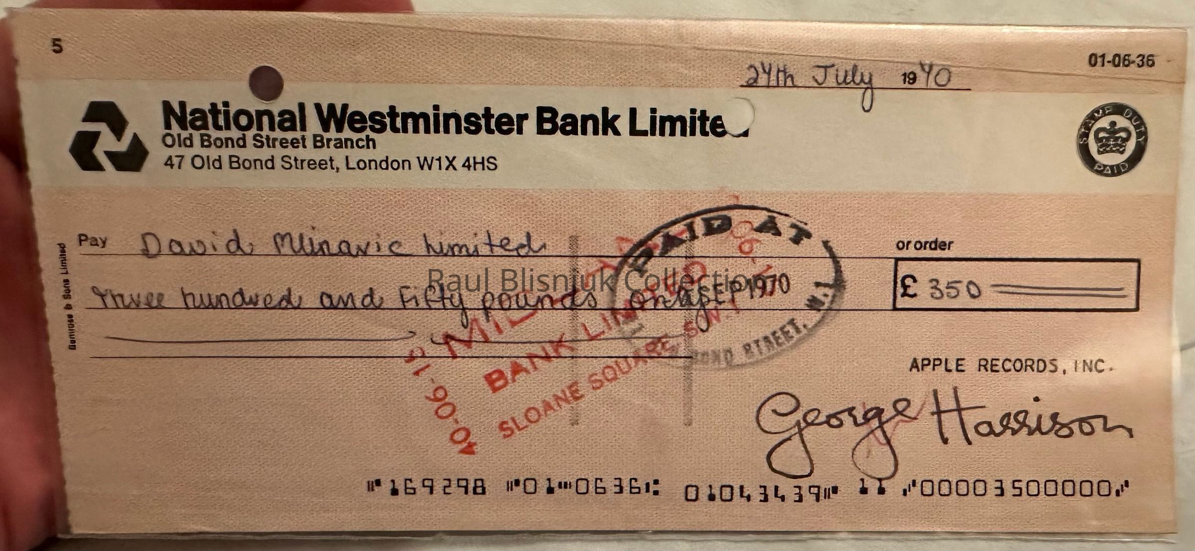 A check made out to David Muravic Limited, three hundred and fifty pounds only, signed by George Harrison in black pen. The check is dated July 24, 1970, from National Westminster Bank Limited.
