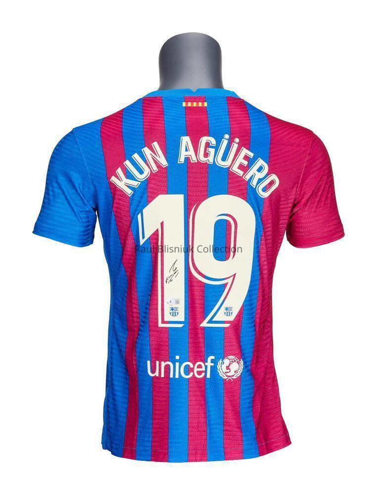 A Nike brand 2021-22 Barcelona jersey signed by Sergio "Kun" Aguero.