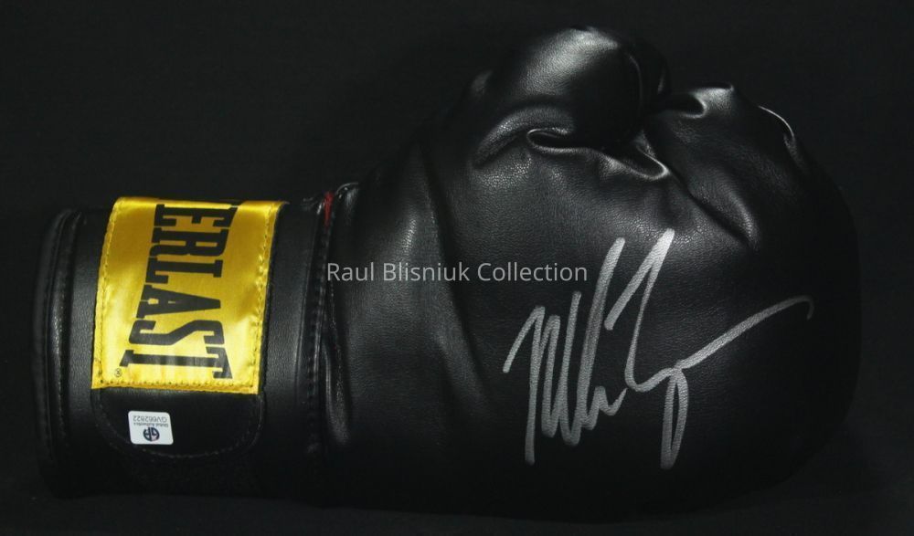 Everlast boxing glove. Hand-signed in silver paint pen by Mike Tyson (HOF). The autograph includes a Global Authentics (GA) hologram and matching COA for authenticity purposes.