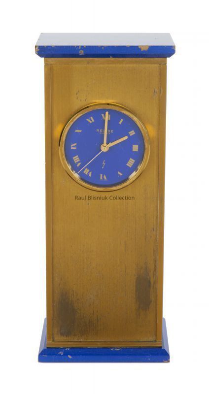 A brass and blue enamel mantel clock from John Lennon and Yoko Ono’s Dakota apartment in New York City, where the couple lived from 1973 to 1980. The clock is signed by Swiss manufacturer Relide and has gold-toned Roman numeral chapters and gold-toned hands against a blue enamel dial. The exterior of the clock, including top, bottom, and sides, have the same blue enamel. Accompanied by a copy of the Sotheby’s catalog.