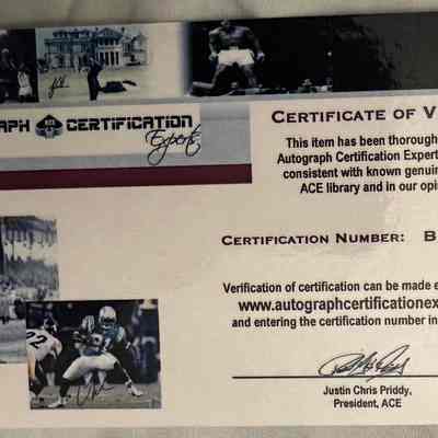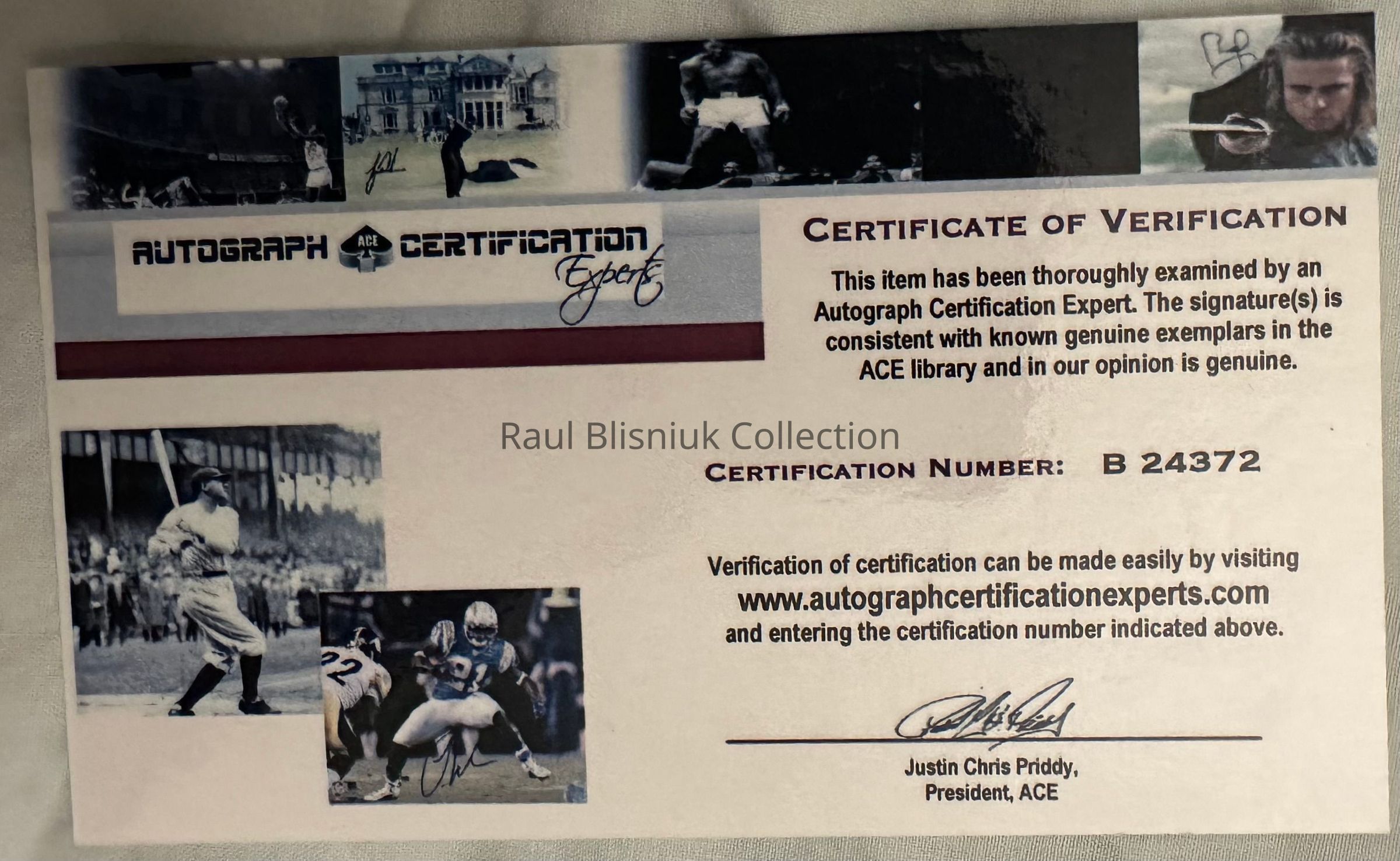 Hand-signed in blue paint pen. Reviewed and authenticated by Autograph Certification Experts (ACE) and includes their official Auction House Letter of Authenticity.