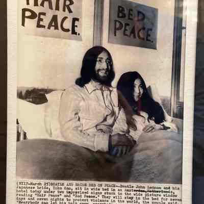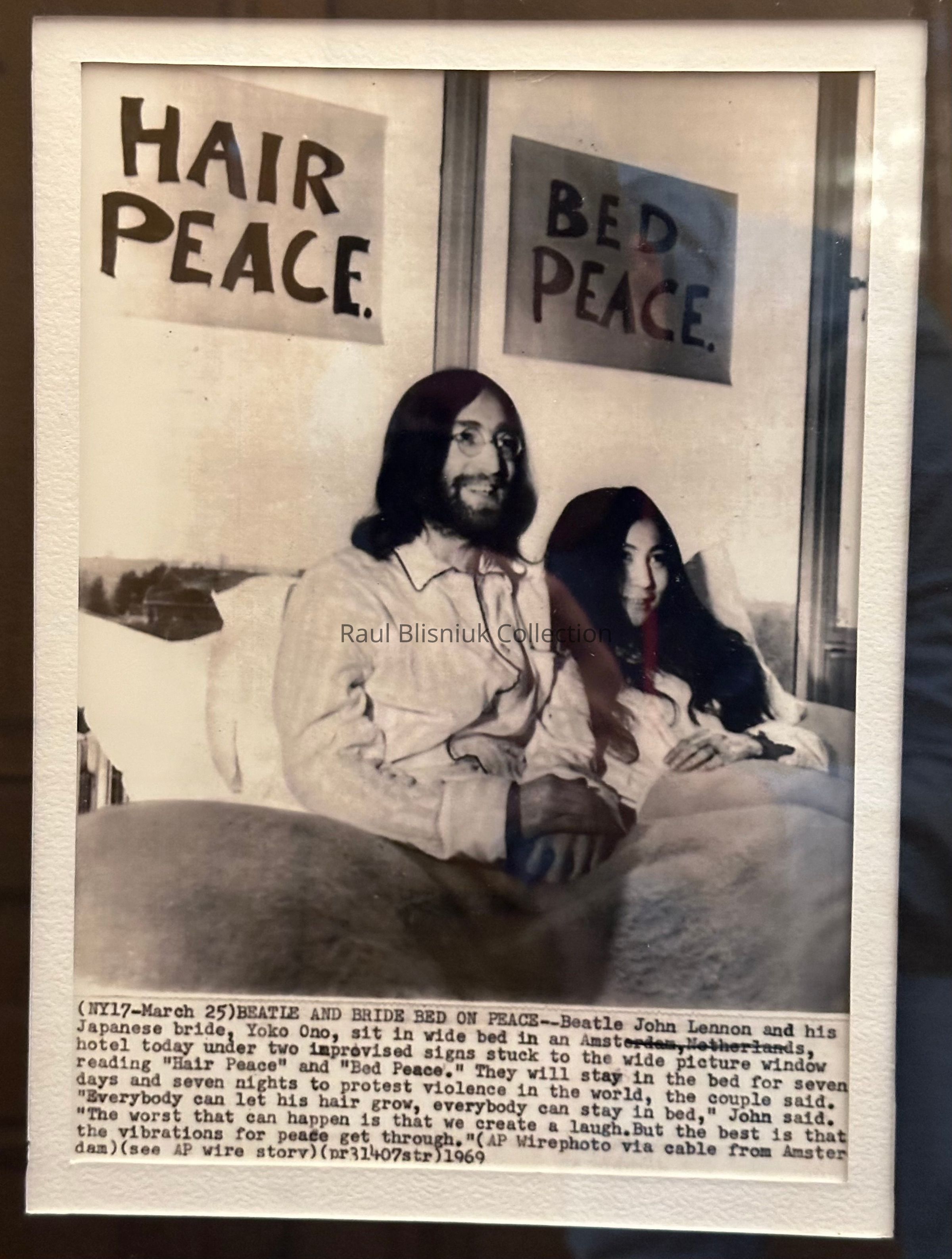(NY17 - March 25) BEATLE AND BRIDE BED ON PEACE -- Beatle John Lennon and his Japanese bride, Yoko Ono, sit in wide bed in an Amsterdam, Netherlands, hotel today under two improvised signs stuck to the wide picture window reading "Har Peace" and "Bed Peace". They will stay in the bed for seven days and seven nights to protest violence in the world, the couple said. "Everybody can let his hair grow, evrybody can stay in bed," John said. "The worst that can happen is that we create a laugh. But the best is that the vibrations for peace get through." (AP Wirephoto via cable from Amsterdam) (see AP wire story) (pr31407str)1969