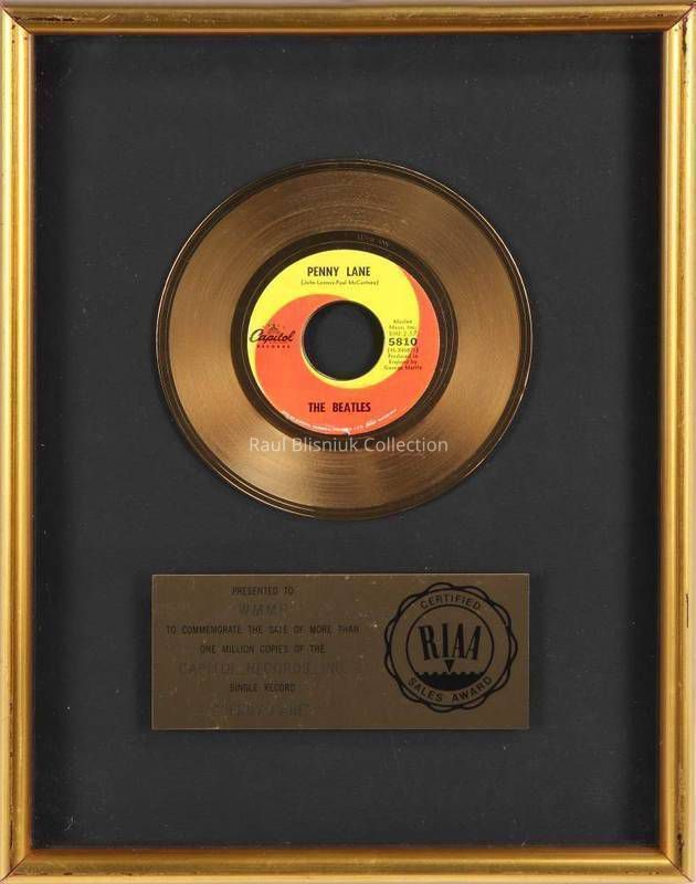 An RIAA "gold" record award presented to WMMR to commemorate the sale of more than one million copies of the Capitol Records single record "Penny Lane." 17 by 13 inches