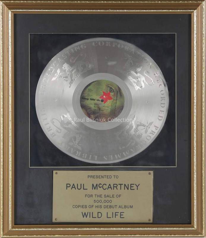 A BBC Recorded Programmes Library Presentation Award given to Paul McCartney for the sale of 500,000 copies of Wings' debut album Wild Life. The album, released in 1971, was McCartney's third non-Beatles album.