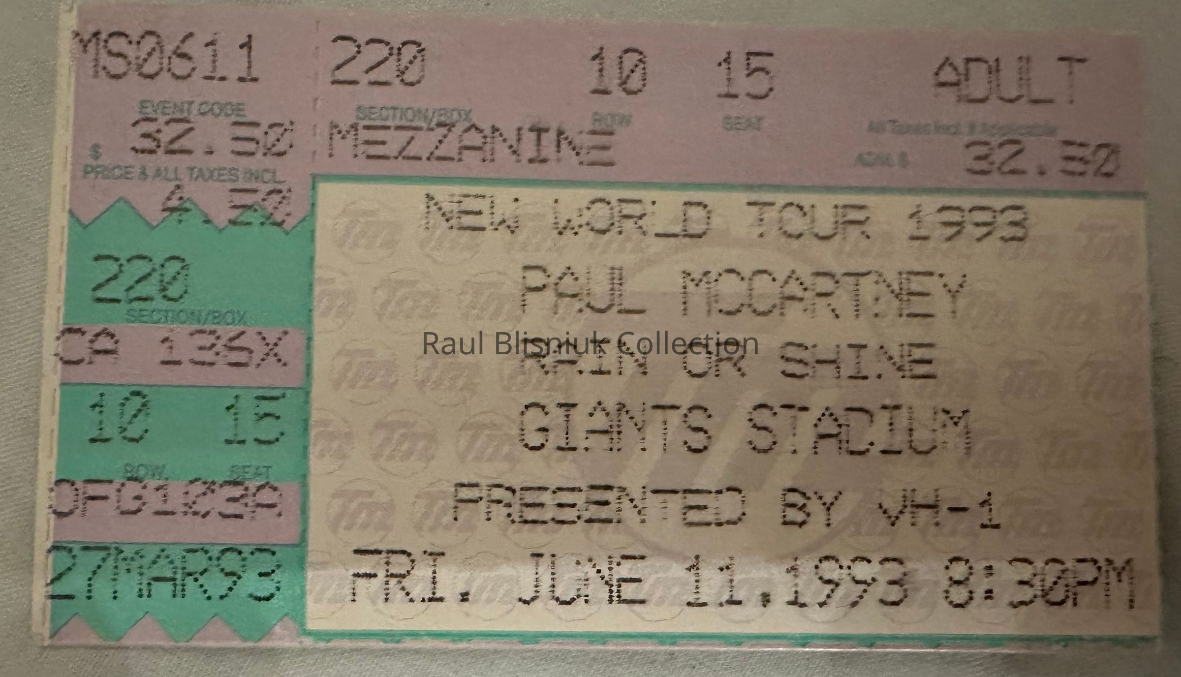 Paul McCartney Concert Ticket Stub 6-11-1993 Giants Stadium New Jersey Vintage