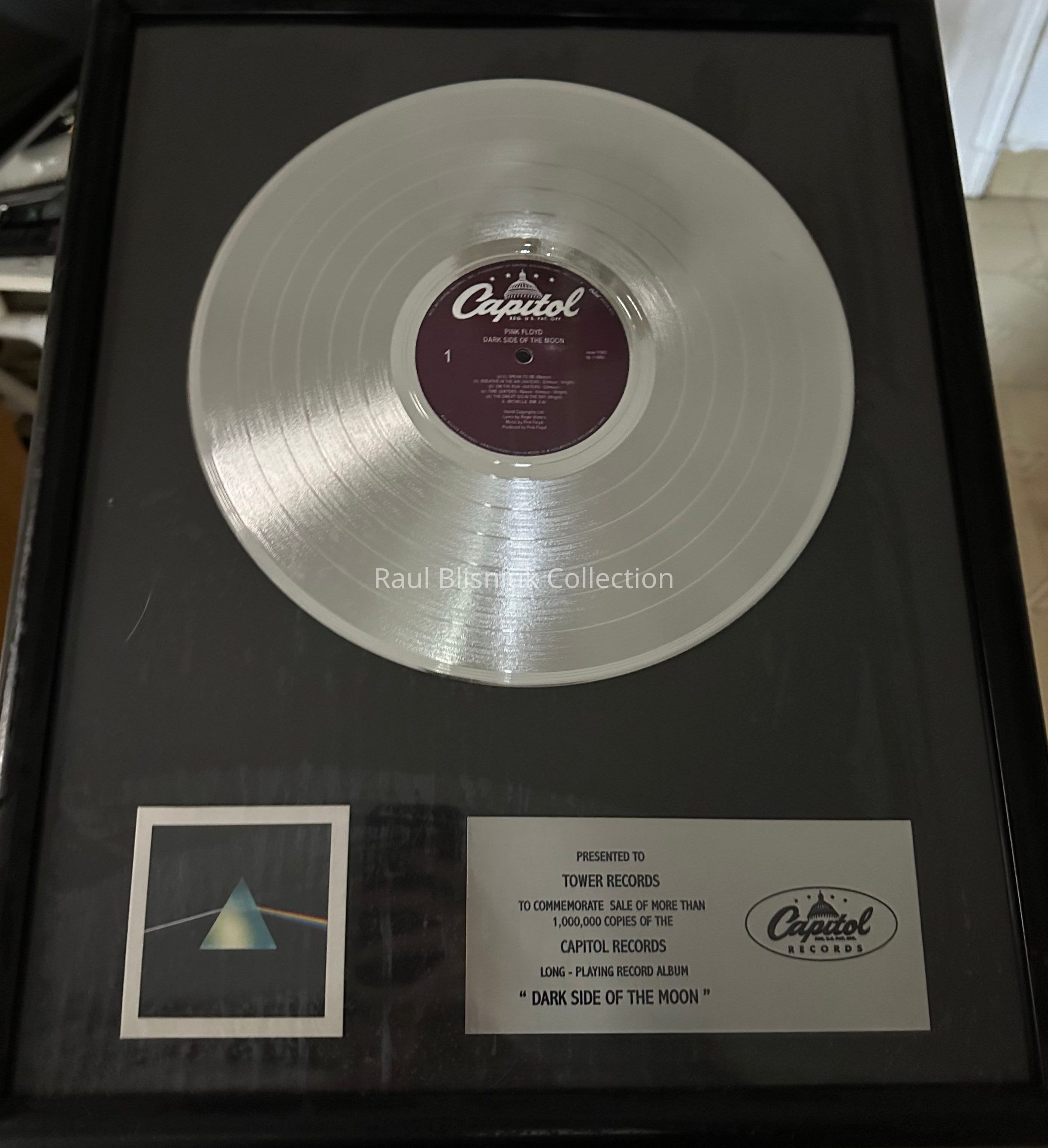 A Capitol Records "platinum" award presented to Tower Records to commemorate sale of more than 1,000,000 copies of the Capitol Records long-playing record album "Dark Side of the Moon".