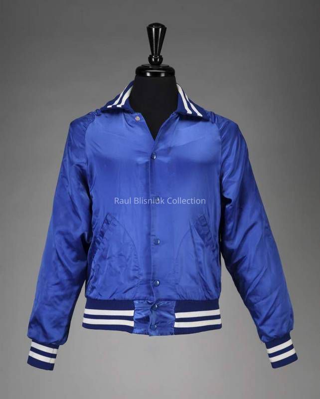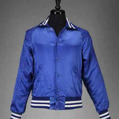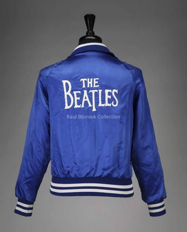 A blue satin jacket with blue and white striped collar, cuffs and waist with snap closure and label reading "Alleson Athletix." The jacket features "The Beatles" on the back embroidered in white thread.