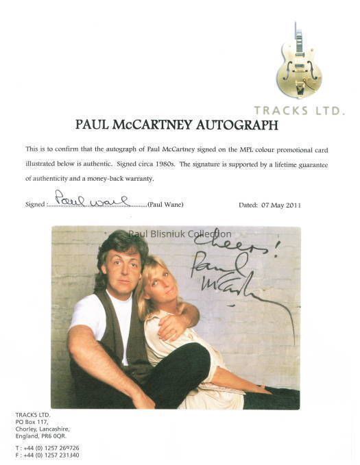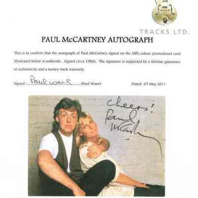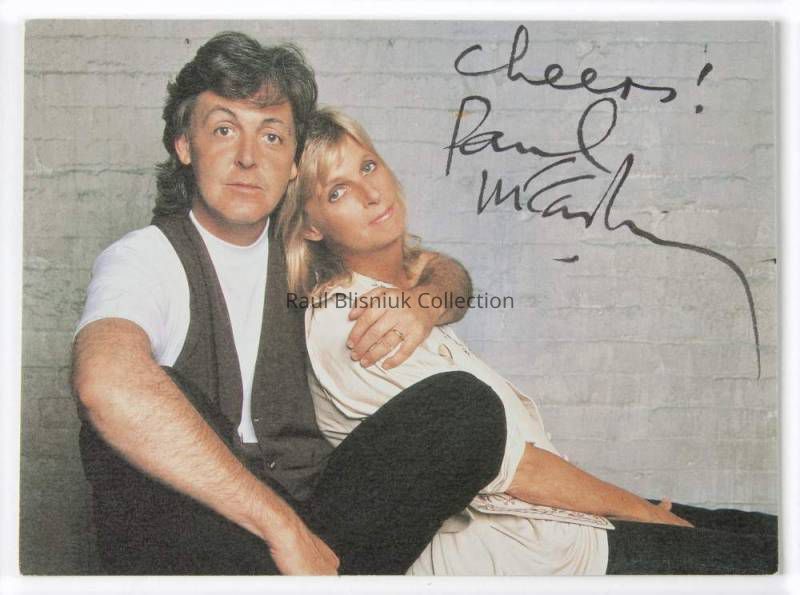 An MPL Communications Ltd. postcard with an image of Paul and Linda McCartney, signed "Cheers! Paul McCartney." The image was taken by photographer Bill Bernstein. Accompanied by a certificate of authenticity from Tracks Ltd. 4 1/2 by 6 inches