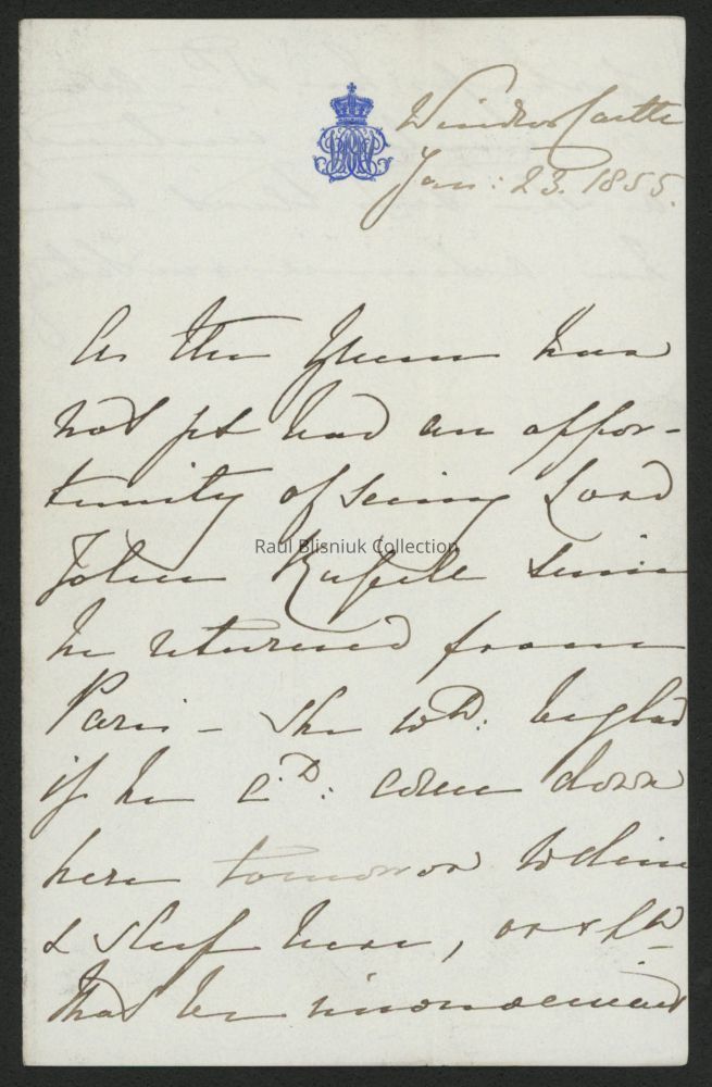 Hand-written letter dated January 23, 1855, measures 4.5" x 7.25" in size and has been hand-signed in black steel-tip fountain pen by Queen Victoria (D. 1901).