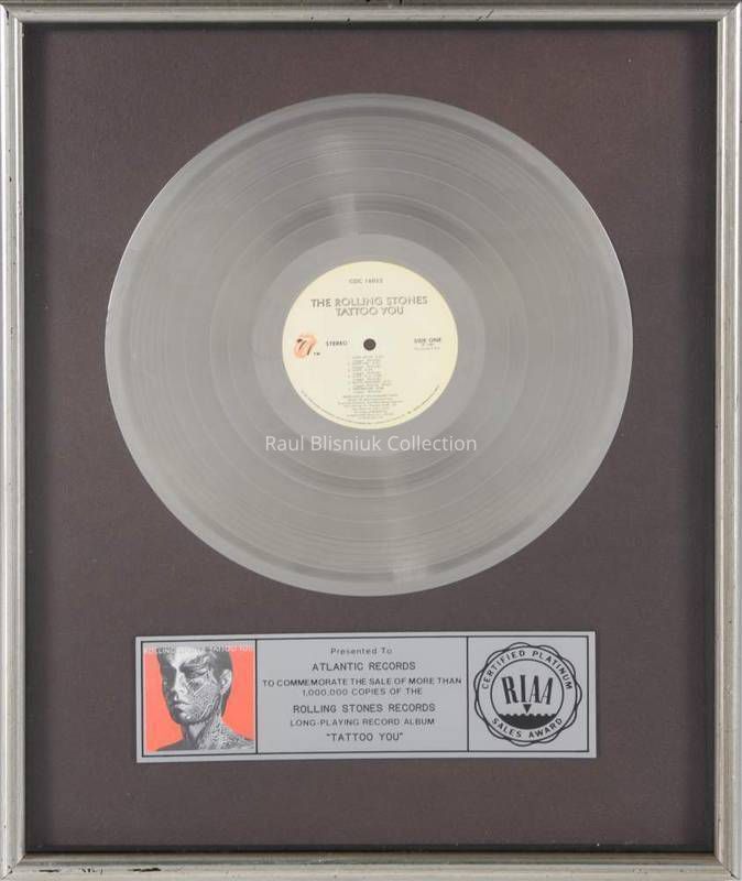 An RIAA "platinum" record award presented to Atlantic Records to commemorate the sale of more than one million copies of The Rolling Stones Records long-playing record album Tattoo You.