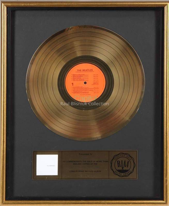 An RIAA "gold" record award presented to KABC to commemorate the sale of more than 500,000 copies of the Capitol Records long-playing record album The Beatles. 21 by 17 inches