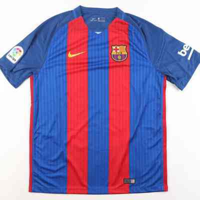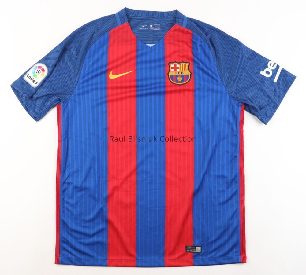 Nike jersey with everything printed on, size L. Hand-signed by Lionel Messi (FC Barcelona). Please note, there is red staining on the reverse number.