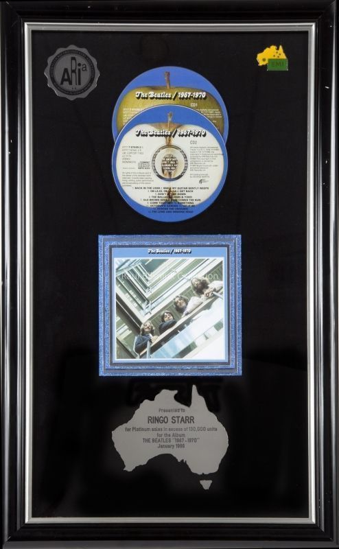 A framed display presented to Ringo Starr for platinum sales in excess of 130,000 units for the album The Beatles 1967 - 1970, presented in January of 1996, and certified by the Australian Recording Industry Association.