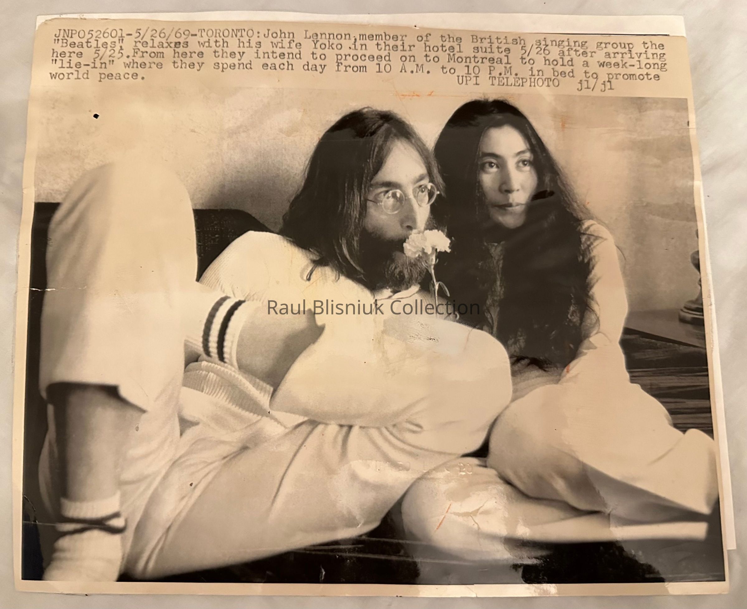 JNP052601 - 5/26/69 - TORONTO: John Lennon, member of the British singing group the "Beatles" relaxes with his wife Yoko in their hotel suite 5/26 after arriving here 5/25. From here they intend to proceed on to Montreal to hold a week-long "lie-in" where they spend each day from 10 A.M. to 10 P.M. in bed to promote world peace. UPI TELEPHOTO jl/jl