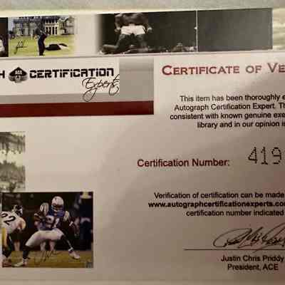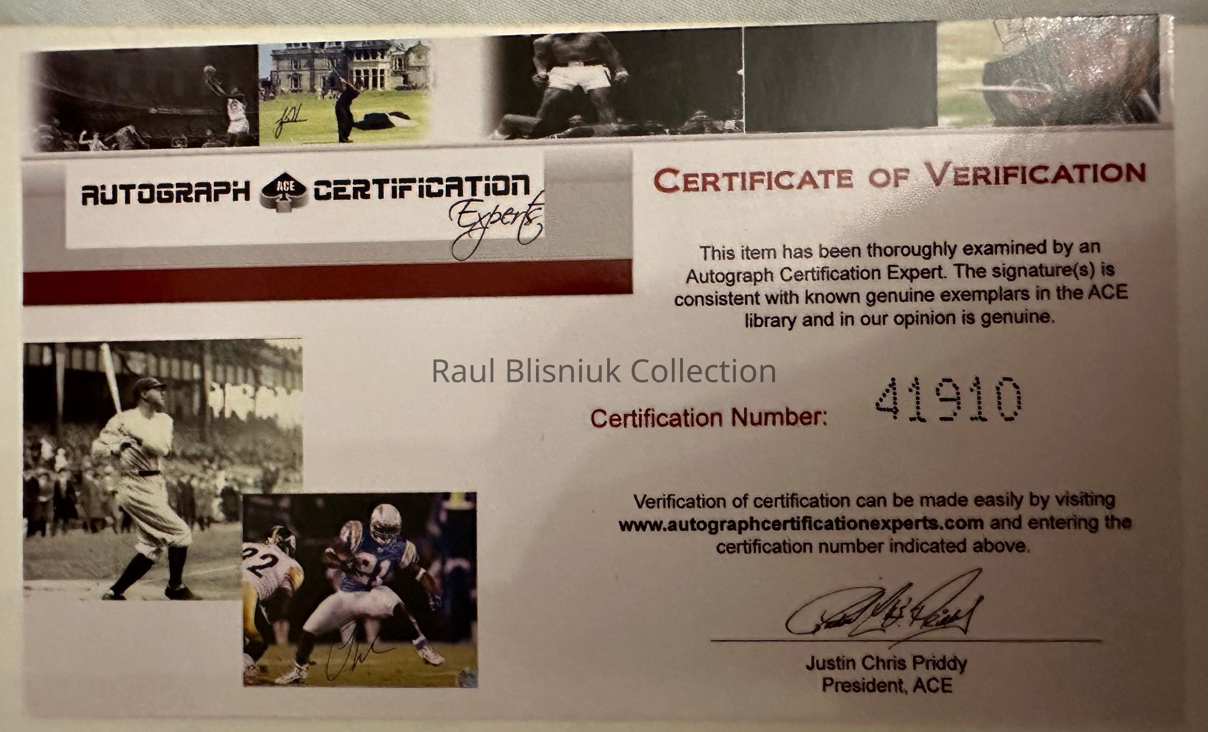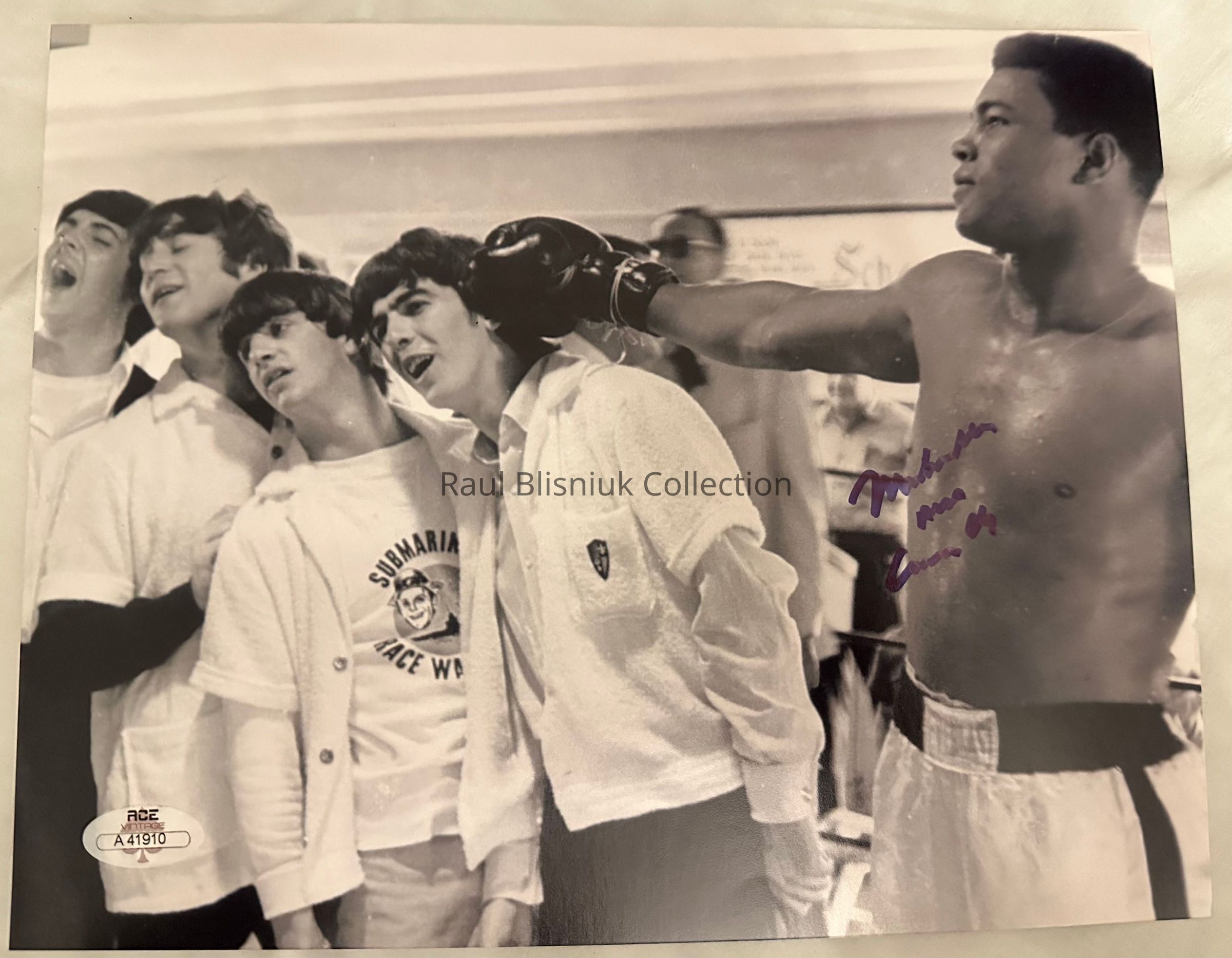 A print of a black and white image originally taken on February 18, 1964, when the Beatles visited with Muhammad Ali at Miami's 5th Street Gym. Ali was training for his fight against Sonny Liston that would occur just over 10 days later. Signed "Muhammad Ali" in blue marker and accompanied by a certificate of verification from ACE.