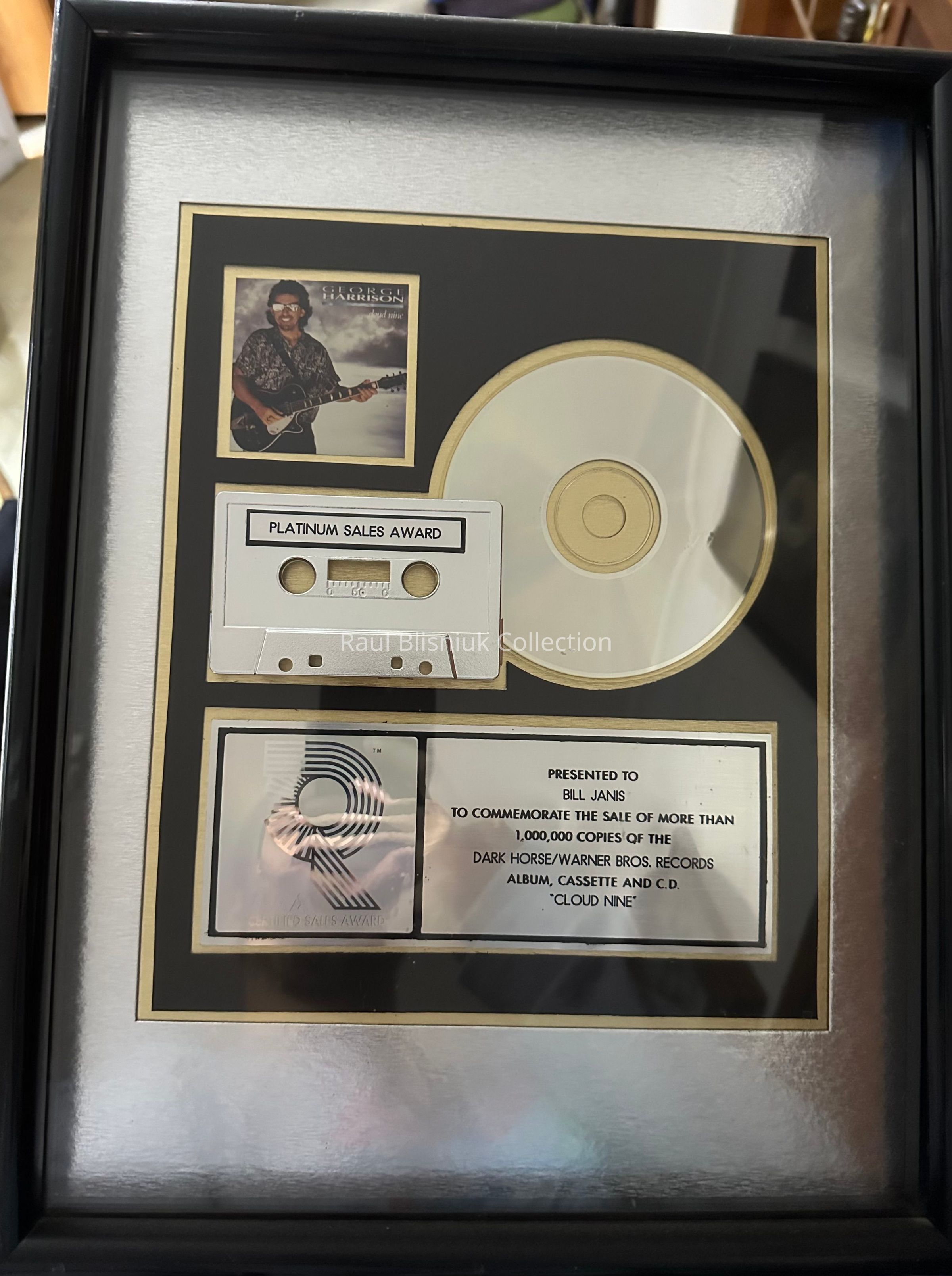 An RIAA "platinum" record award presented to Bill Janis to commemorate the sale of 1,000,000 copies of the Dark Horse / Warner Bros. Records album, cassette and C.D. "Cloud Nine".