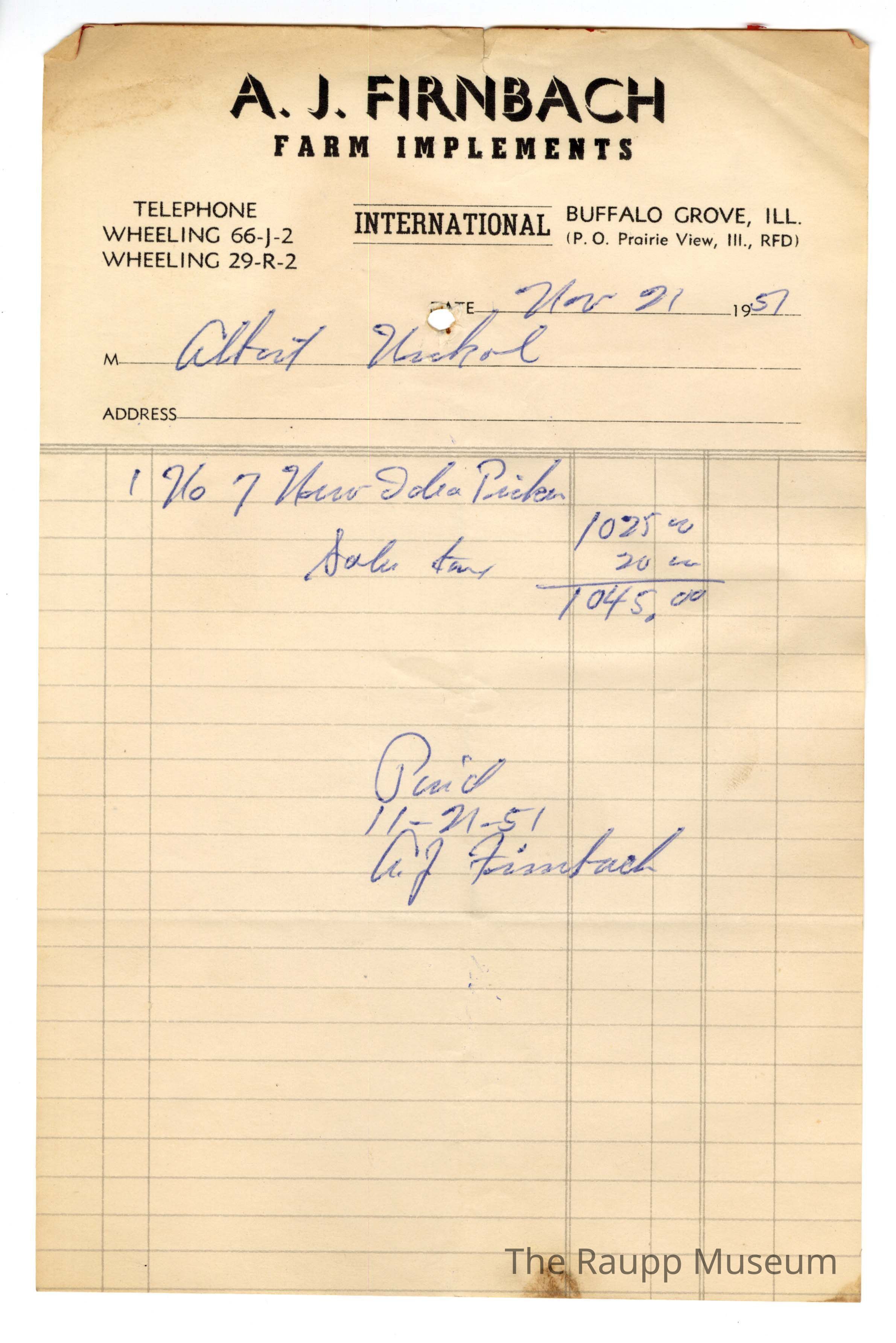 One (1) brown rectangular receipt from A. J. Firnbach Farm Implements store in Buffalo Grove, for Albert Nickol on November 21, 1951. Receipt is for a No. 7 [unknown] Picker for $1025.00. After tax, the total is $1045.00. There are preprinted portions and handwritten portions in blue ink. Signed and dated by AJ Firnbach on the bottom.