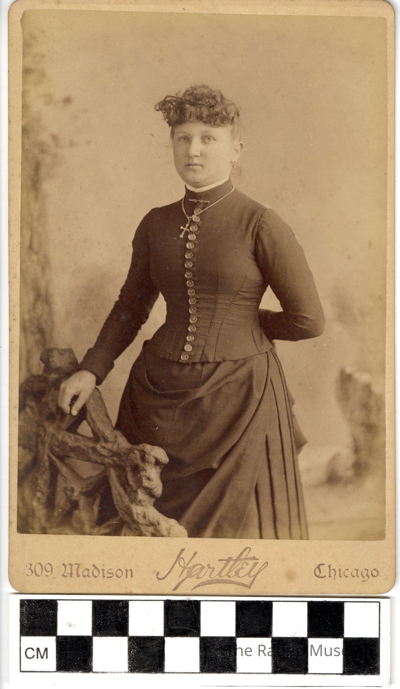 One (1) black and white sepia toned photograph of a woman. She is wearing a two piece black dress, with a button down black top and black skirt with pleats around the back. She has on a silver cross necklace. Her hair is up with curls in the front. Her left hand is resting on a wooden The photo is attached to a beige mat board with brown print on the bottom: "Hartley, 309 W. Madison St., Chicago".