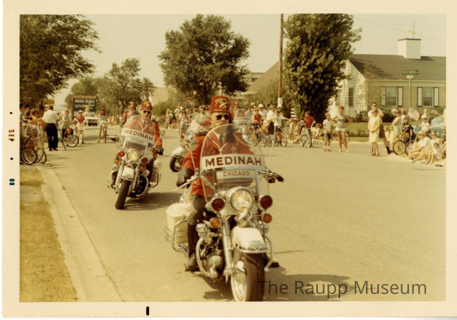 One (1) color photograph of men on motorcycles. The Motorcycles have "Medinah Chicago" printed on the front, with white, red, and orange lights. They are wearing red suit/blazers with black pants and a red tall hat that has the "medinah" logo on it.  The motorcycles look to be making an "s" pattern with one leader in the left side and others swerving from the right. The "Mark Drugs Walgreens" float is in the background.Made/Created