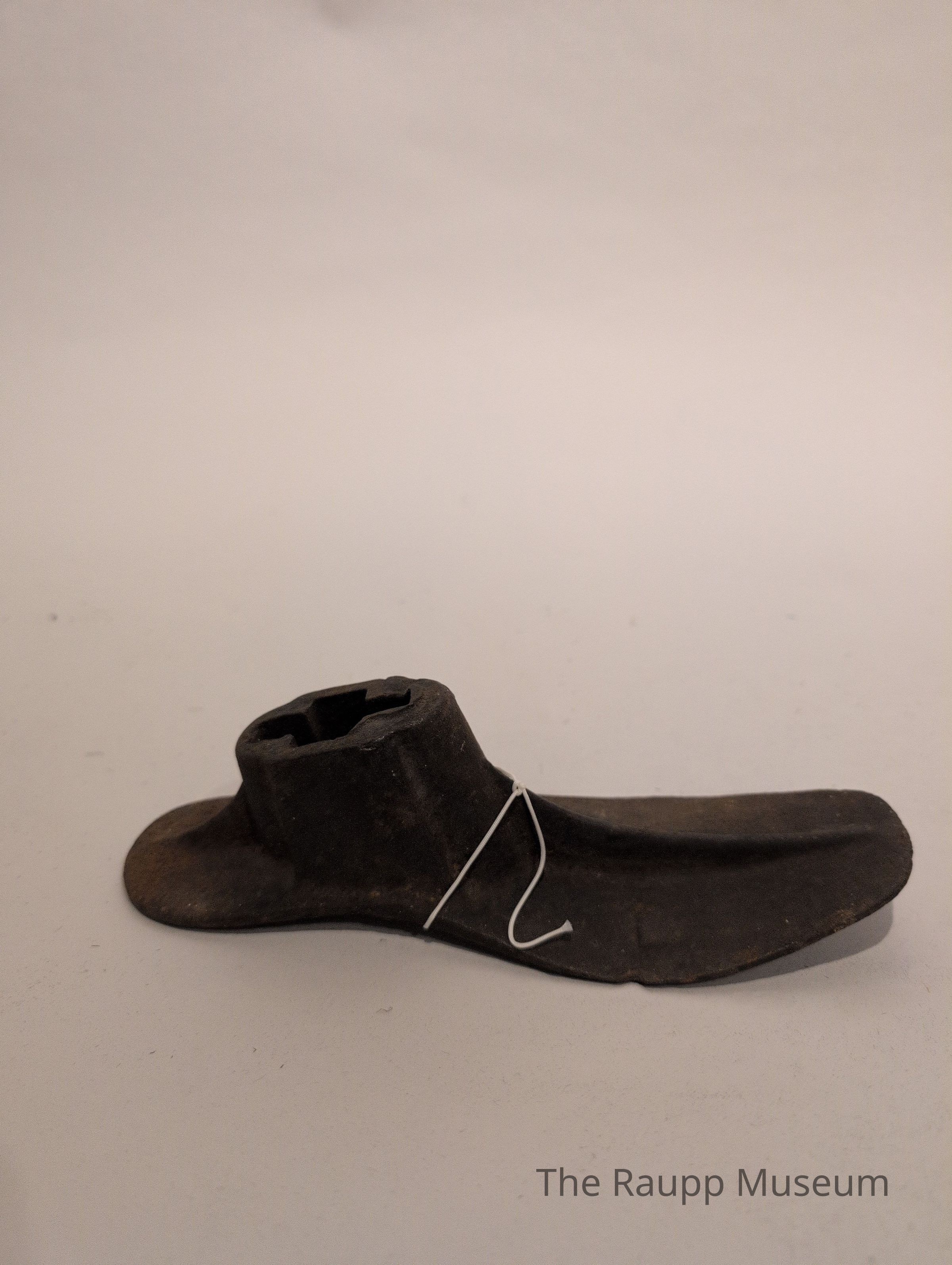 One (1) cast iron brown shoe last. Last used to repair shoes, shaped like the bottom of a shoe - fits onto shoe last stand.