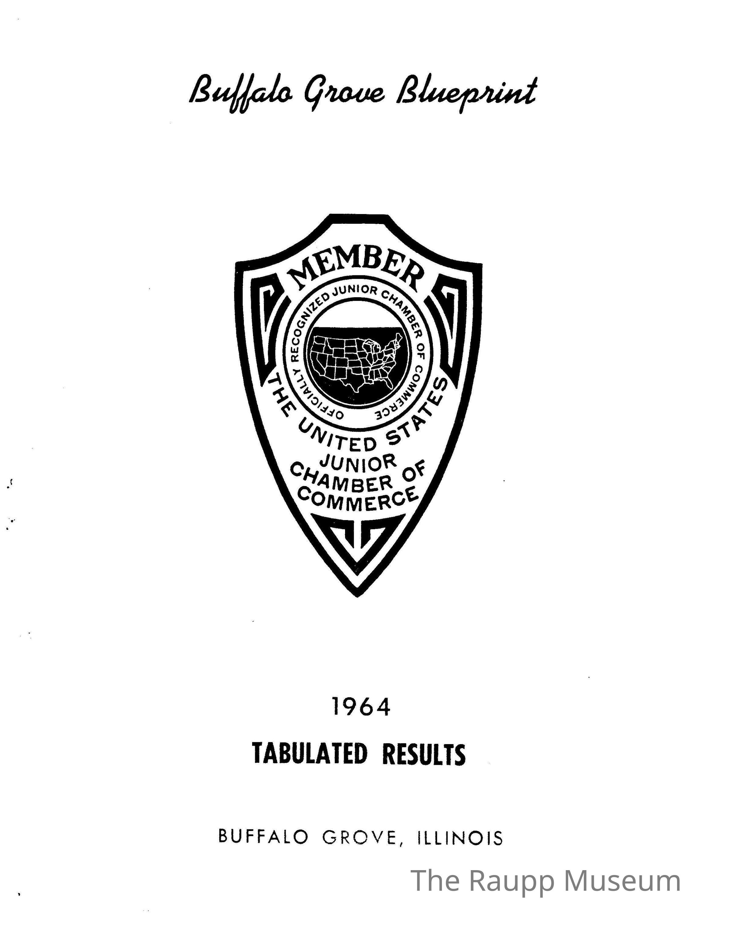 One (1) copy of a report of surveys taken of Buffalo Grove residents in 1964 by the Buffalo Grove Blueprint, Junior Chamber of Commerce. Included are 21 pages of statistics and a cover and back page. The cover has the US Junior Chamber of Commerce logo on it, with "Buffalo Grove Blueprint", "1964; Tabulated Results; Buffalo Grove, Illinois". The back cover is blank. Copy is black and white.
