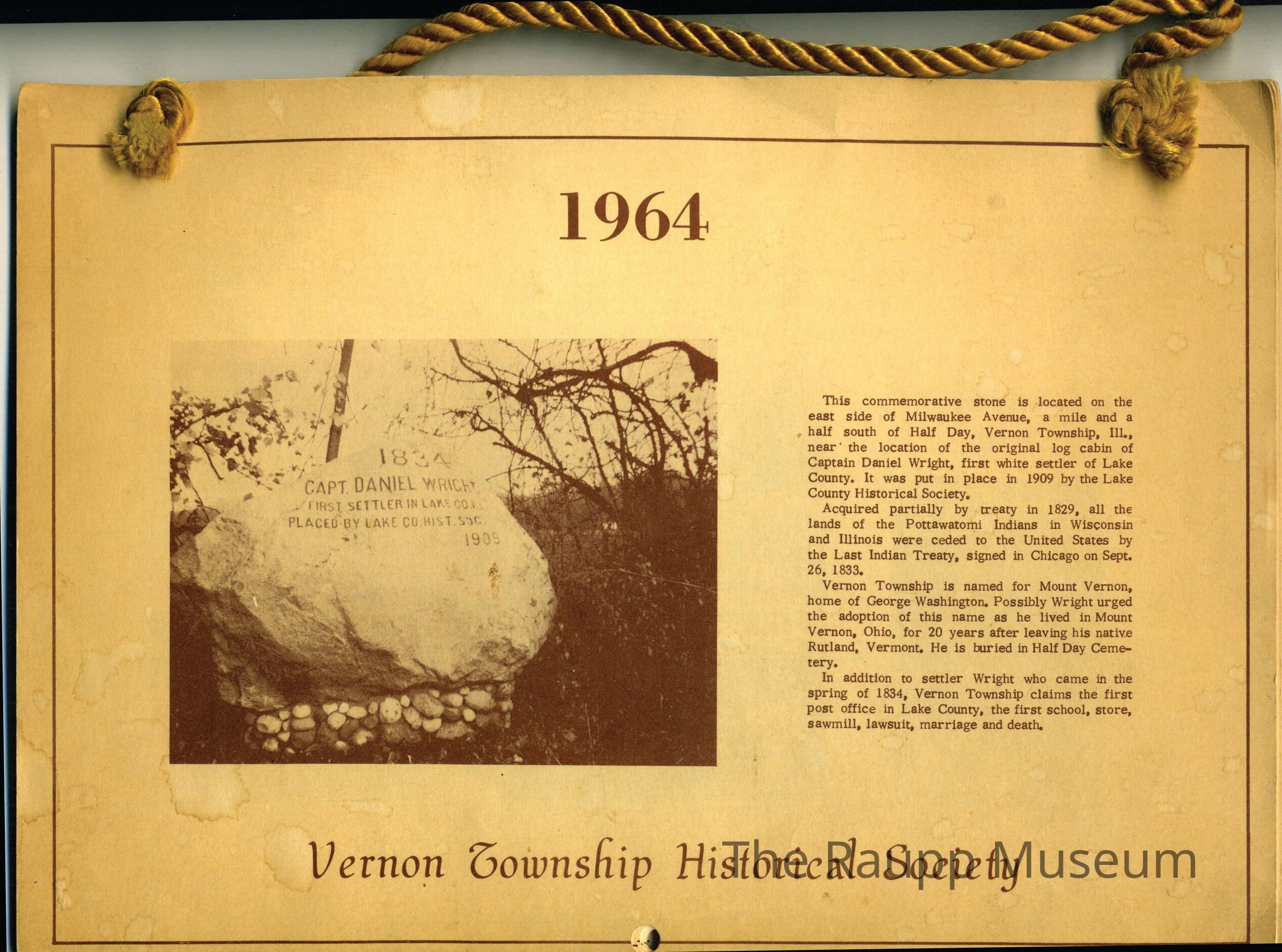 Horizontal Vernon Township Historical Society calendar dated 1964. Printed on heavy tan paper. 16 unbound pages each with three hole punches for hanging, double sided with sepia text and images. Gold color braided yarn cord, knotted at ends through hole punches for hanging.