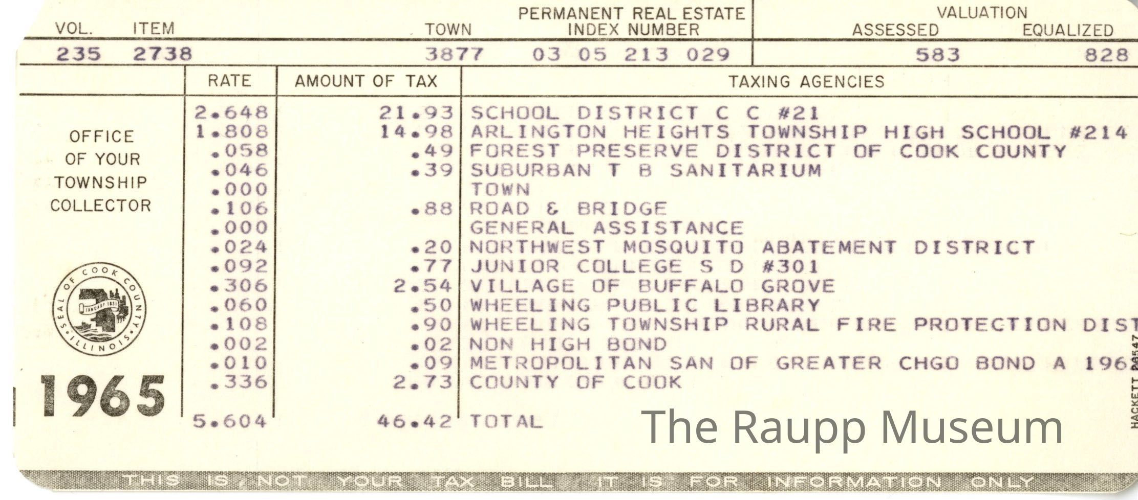 One (1) receipt record for taxes for 1965 for property 0305213029. The receipt is a long rectangle, and documents the rate and amount of tax for each item, including school districts, library, roads, etc. to pay for this property. The amount of tax totals $46.42.