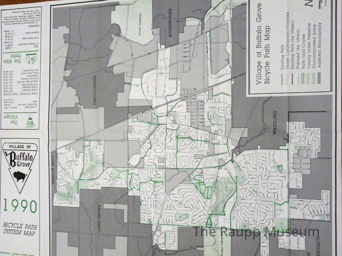 Single-sided green and gray colored map of Buffalo Grove bike paths. With black and white text. Planned paths indicated as well as existing paths. Parks and forest preserves also indicated on the map. Map key located in the lower right corner. White cover with inverted triangle logo and green "1990" located on the far left. With five intersecting vertical creases and one horizontal crease.Map Details