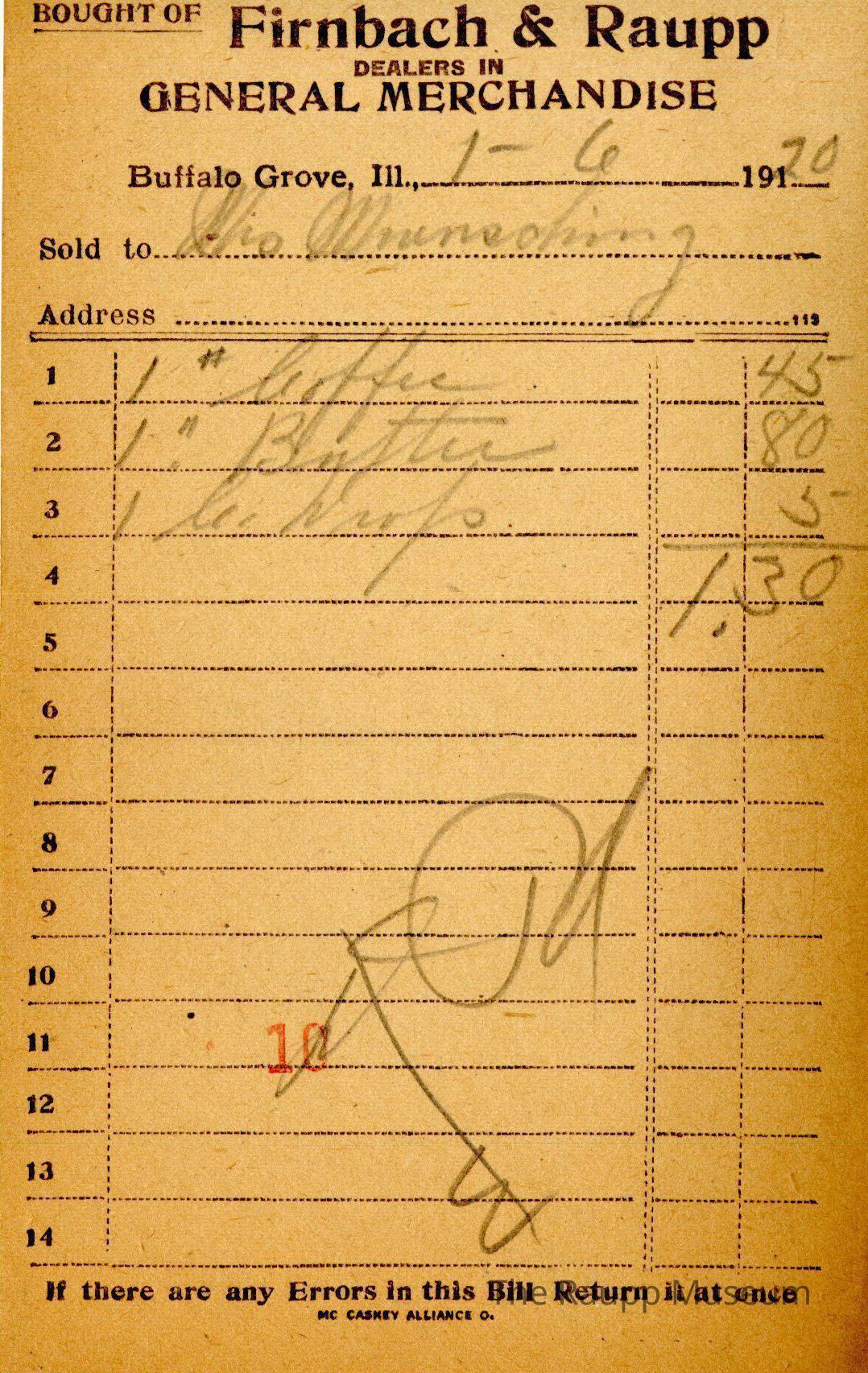 The black text is as follows, from top to bottom: "Bought of Firnbach and Raupp dealers in GENERAL MERCHANDISE" Buffalo Grove Ill.; Sold to; address; if there are any Errors in this Bill Return it at once; MC CASKEY ALLIANCE O."Archive Details