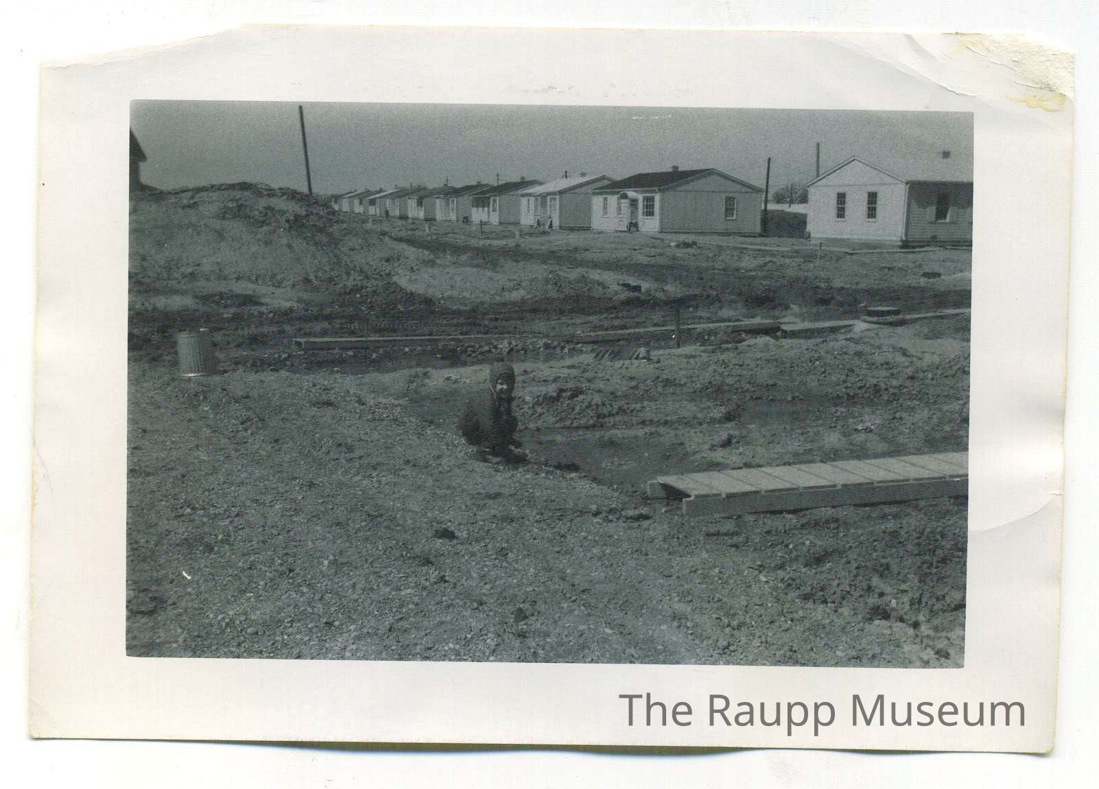 Black and white print with white border. Image of a child crouched on the ground in the center of a housing development. Muddy puddles and wooden plank for walking on to the right. Image notable for the row of newly constructed Buffalo Grove houses in the background. Image printed on Kodak paper.Made/Created