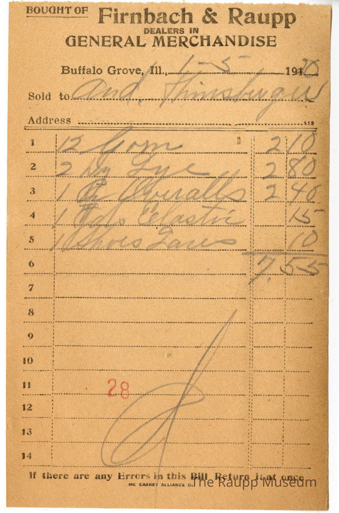 The black text is as follows, from top to bottom: "Bought of Firnbach and Raupp dealers in GENERAL MERCHANDISE" Buffalo Grove Ill.; Sold to address; if there are any Errors in this Bill Return it at once; MC CASKEY ALLIANCE O."Archive Details