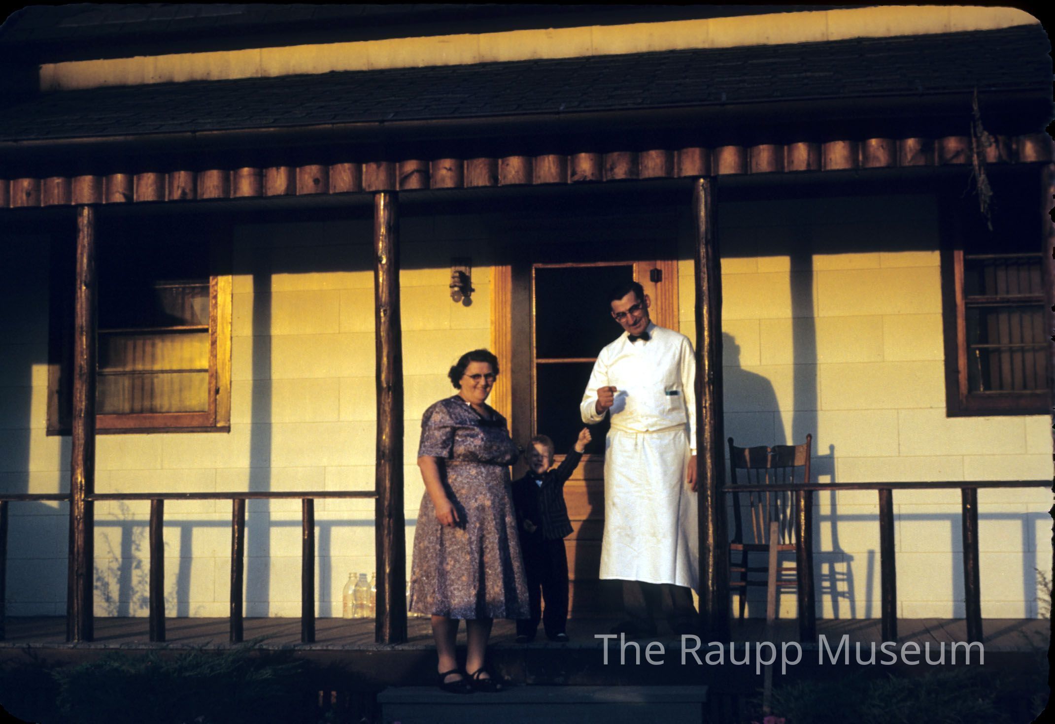 One (1) photographic copy of three individuals standing outside Bill's Buffalo House, on the side door. Photo is labeled Grandpa and Grandma (the gentleman is "Bill" who owned the restaurant and tavern. There is a young boy in a black suit standing on the porch between the two adults, with his left hand up. There are clear milk bottles on the porch, and a wooden chair. The door is right behind them, with a porch overhang, and white cinderblock walls.Made/Created