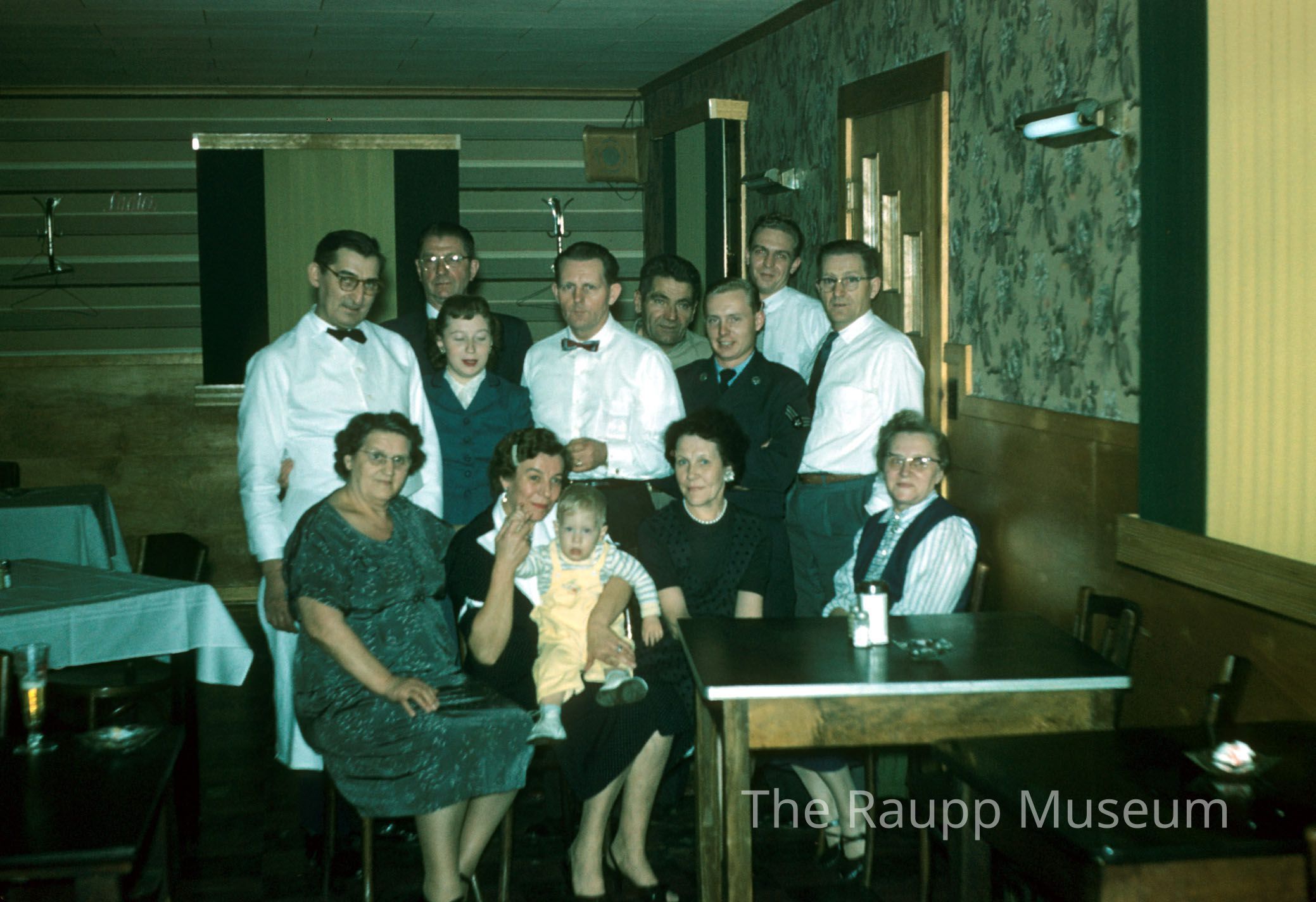 One (1) photographic copy of Bill Heinzelmann and his family inside Bill's Buffalo House. Bill is standing in the second room on the left. There are four women seated in front, with one holding a baby boy, four men and one women in the second row (2 with server uniforms on, one in a shirt and tie, and one in a military uniform). There are three men standing in the third row. They are blocking a wooden door, but in front of a square table, with other tables and seating around them.Made/Created
