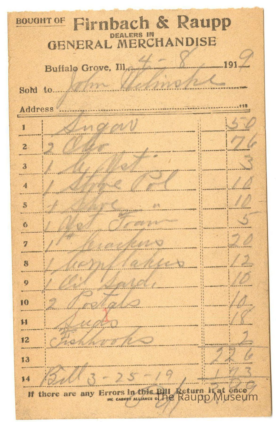 One (1) Firnbach and Raupp store receipt from April 8, 1919. Receipt is rectangular with black printed text and handwritten notes in pencil. The receipt is for John Welniske(?) who bought sugar for $0.50, 2 oleo for $0.76, 1 yeast for $0.03, 1 stove polish for $0.10, 1 shoe polish for $0.10, 1 yeast foam for $0.05, 1 pound crackers for $0.20, 1 corn flakes for $0.12, 1 oil sand(?) for $0.10, 2 postals for $0.10, seeds for $0.18, fish hooks for $0.02.. Bill total was $2.26 and there is a bill from March 25, 1919 for $1.73 that was combined to make the total $3.99. The bill is marked as paid. There is a red stamp of 1 close to the bottom.