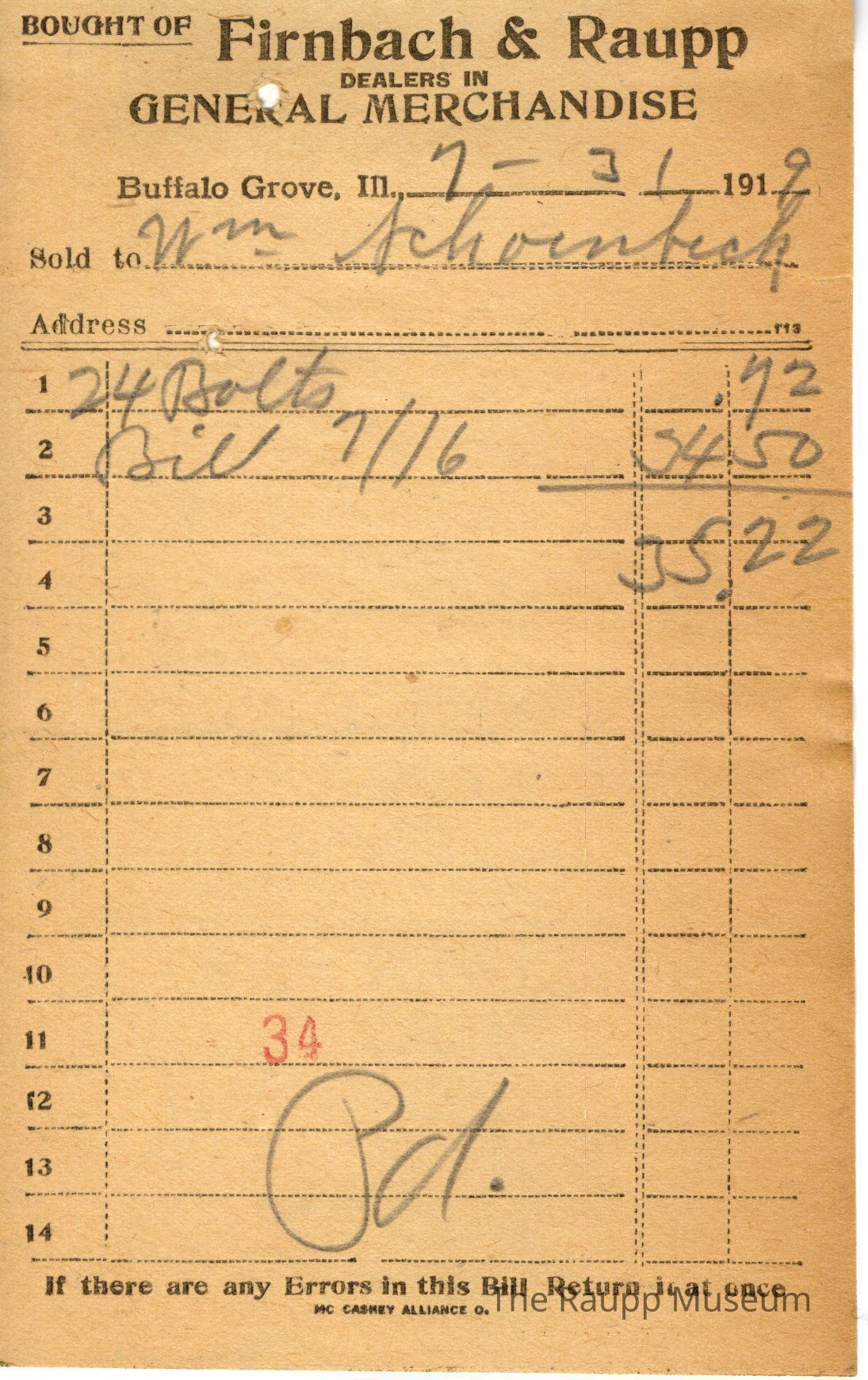 One (1) Firnbach and Raupp store receipt from July 31, 1919. Receipt is rectangular with black printed text and written notes in pencil. The receipt is for Wm Shoenbeck, who bought 24 bolts for $0.72. The bill was added to a previous bill of $34.50 from July 16th to total $35.22. There is a red stamp of "34" at the bottom with the bill marked as paid.