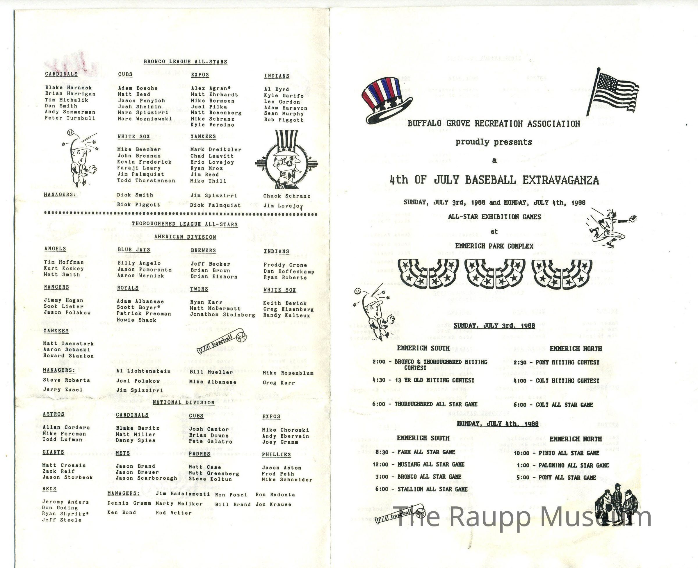 Trifold schedule of events for the Fourth of July baseball celebration. Black and white text and patriotic clip art. Hand colored Uncle Sam's hat and July illustrations. Print on both sides. Vertical and horizontal creases. Dated July 3-4, 1988