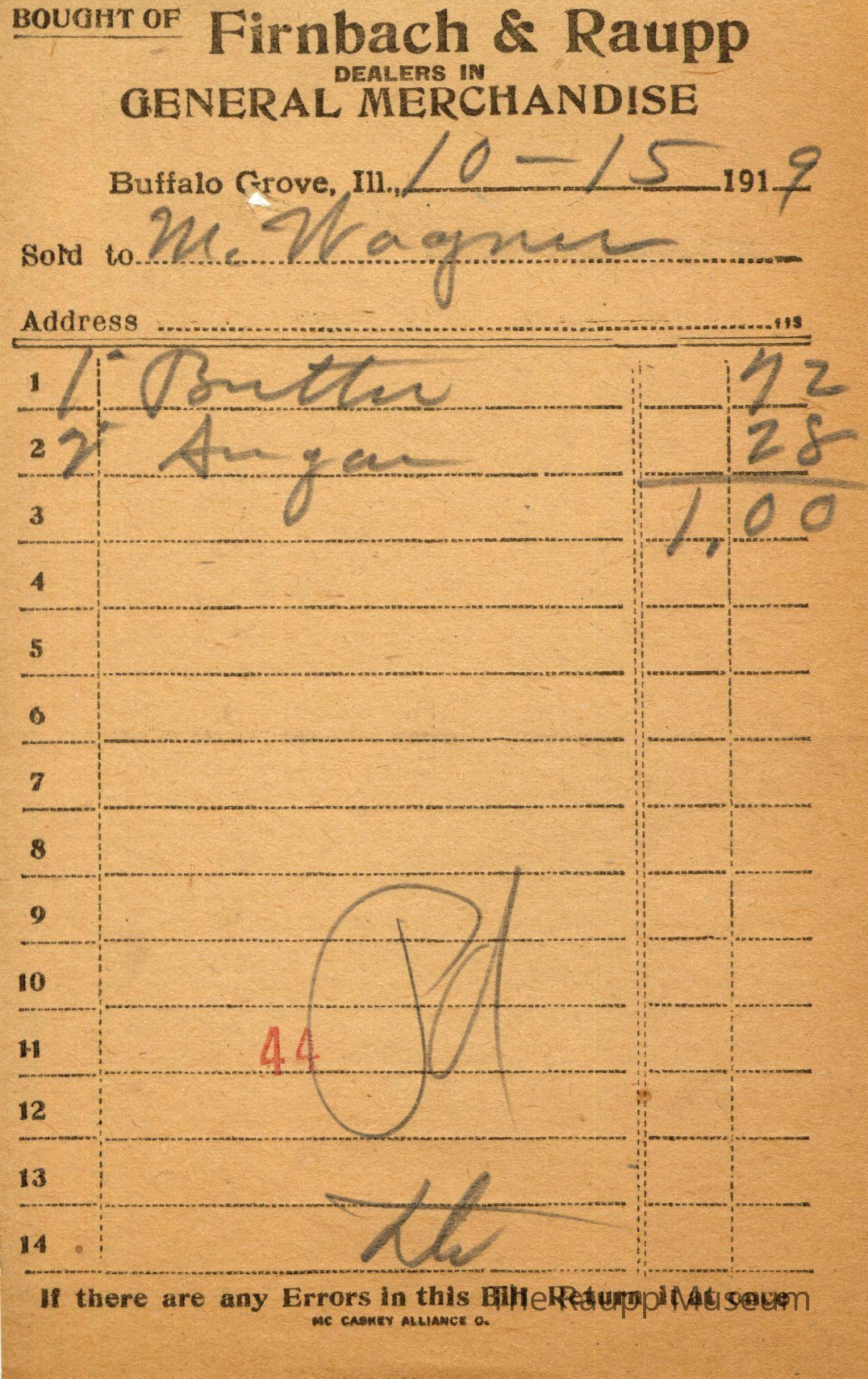 One (1) Firnbach and Raupp store receipt from October 15, 1919. Receipt is rectangular with black printed text and written notes in pencil. The receipt is for M. Wagner, who bought one pound of butter for $0.72 and two pounds of sugar for $0.28. The total is $1.00 and the receipt is marked as paid. A red stamp of 44 is located towards the bottom of the page. The text from top to bottom is: BOUGHT OF Firnbach & Raupp; DEALERS IN GENERAL MERCHANDISE; Buffalo Grove, Ill.; Sold to; Address; If there are any Errors in this Bill Return It at once; MC CASKEY ALLIANCE O.Archive Details