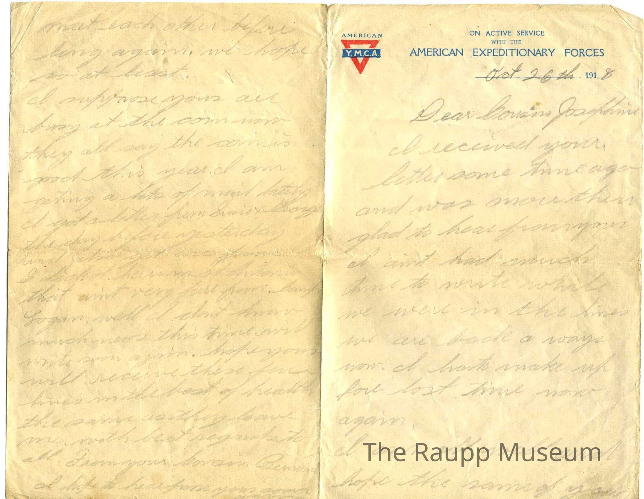 One sheet correspondence on American YMCA letterhead with bi-fold, writing in pencil on three sides and envelope. Top left corner of the paper has YMCA color logo with “On active service with the American Expeditionary Forces” and handwritten “October 26th 1918" in the uppper center. Letter is primarily about corn crop and the weather. Unsigned.